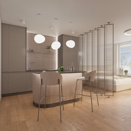 Návrh kuchyně navazoval na návrh koupelny. Ta se klientům natolik líbila, že chtěli v tomtéž duchu pokračovat. Jedním z požadavků, který architekt Jindřich Kobr naplno vyslyšel, bylo použití modré barvy. Ta v kuchyni dominuje. Doplnilo ji pouze dřevo horních skříněk i ostrůvku a písková dlažba. Navazující stěna získala obklad ve tvaru hexagonu s paprskovitým efektem. Do přilehlé niky je možné uložit značnou zásobu dřeva pro velká kachlová kamna. Výrazným prvkem kuchyně je houpačka, kterou si klienti velmi přáli. Její uzly podtrhují přímořský styl, který je pro celou kuchyni typický. Spotřebiče, židle, trnože, úchyty či světla jsou v černém provedení. Kontrast barev je o to výraznější.