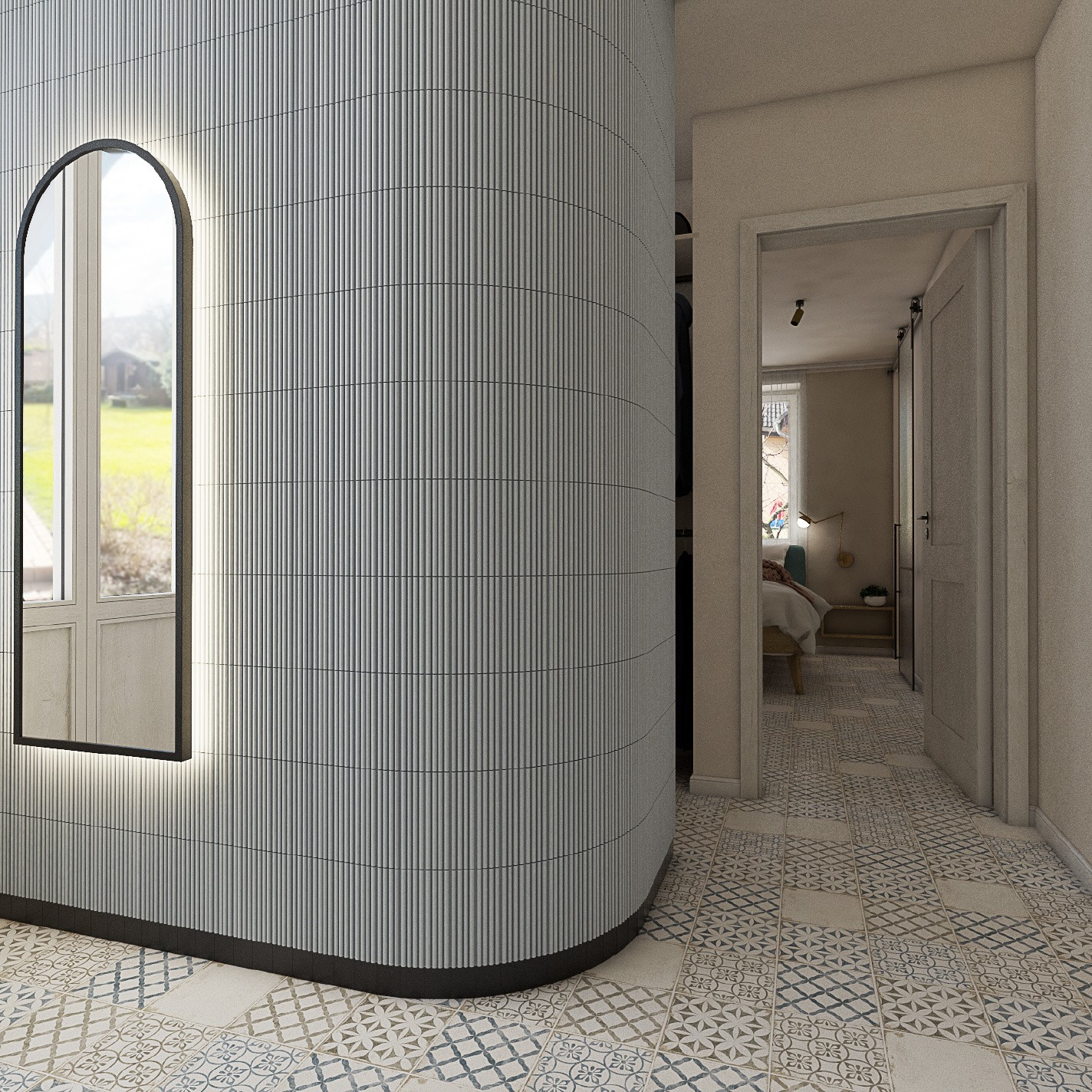 Cesta k návrhu interiéru rodinného domu vedla přes koupelny. S těmi byli klienti natolik spokojeni, že požádali architekta Jindřicha Kobra o navržení celého domu. Jindřich se do díla pustil s vervou a pozměnil původní dispozice tak, aby domov získal více světla a svým majitelům lépe sloužil. Ostré hrany v přízemí zjemnil obloukovými prvky s 3D vlnkovitým keramickým obkladem na ostrůvku otevřené kuchyně i na stěnách vstupní haly. Srdcem interiéru se stal prostorný jídelní stůl s židlemi značky TON v různých tvarech i barvách. Podlahu s dlažbou v imitaci dřeva střídá výrazná patchworková dlažba, na které najdeme sedm různých motivů a barev. Modrou, která je nejvýrazněji zastoupená na stěrkovém schodišti a tapetě, přírodní hnědou, béžovou, bílou a černou doplňuje v interiéru ještě mosaz. Tu najdeme i na originálním osvětlení nad jídelním stolem. Venkovský styl v moderním hávu poskytuje útulné bydlení se vším, co k němu patří.