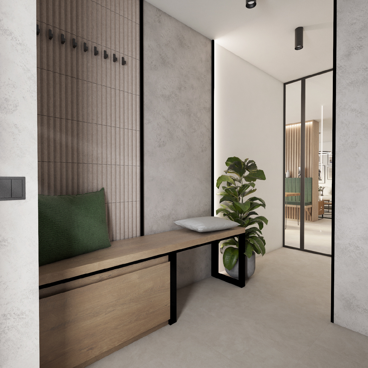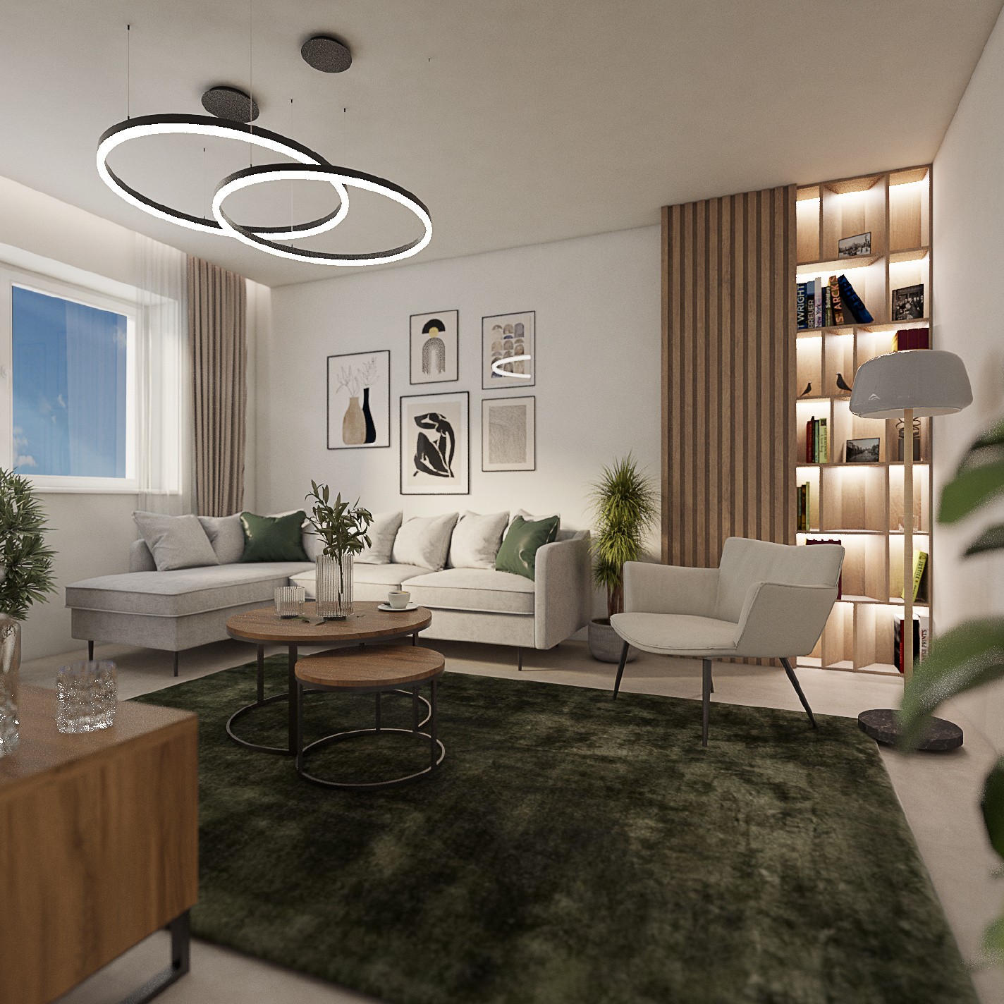 Z každého jednotlivého prvku haly, obývacího pokoje, jídelny i kuchyně je cítit teplo domova. Velkou měrou se na tom podílí teplé zemité odstíny i zelená barva koberce, květin a textilií. Světlá dlažba většiny ploch nechává vyniknout dřevěné prvky v kuchyni, v knihovnách a především na předělové příčce. Vertikály typické pro celý prostor upoutají už v hale, kde jsou vytvořené z dlaždiček, které doplňují černé háčky. Černá barva místnosti opepřuje. Stačí sem tam nějaké zrníčko a příjemný kontrast je na světě. Hlavní úložný prostor se schoval za posuvné zrcadlo. Domov působí čistě, útulně i minimalisticky a přitom je všechno podstatné na dosah ruky. Za jednotně laděným interiérem stojí osvícenost klientů, kteří navrhování nechali na odbornících, našich architektech.