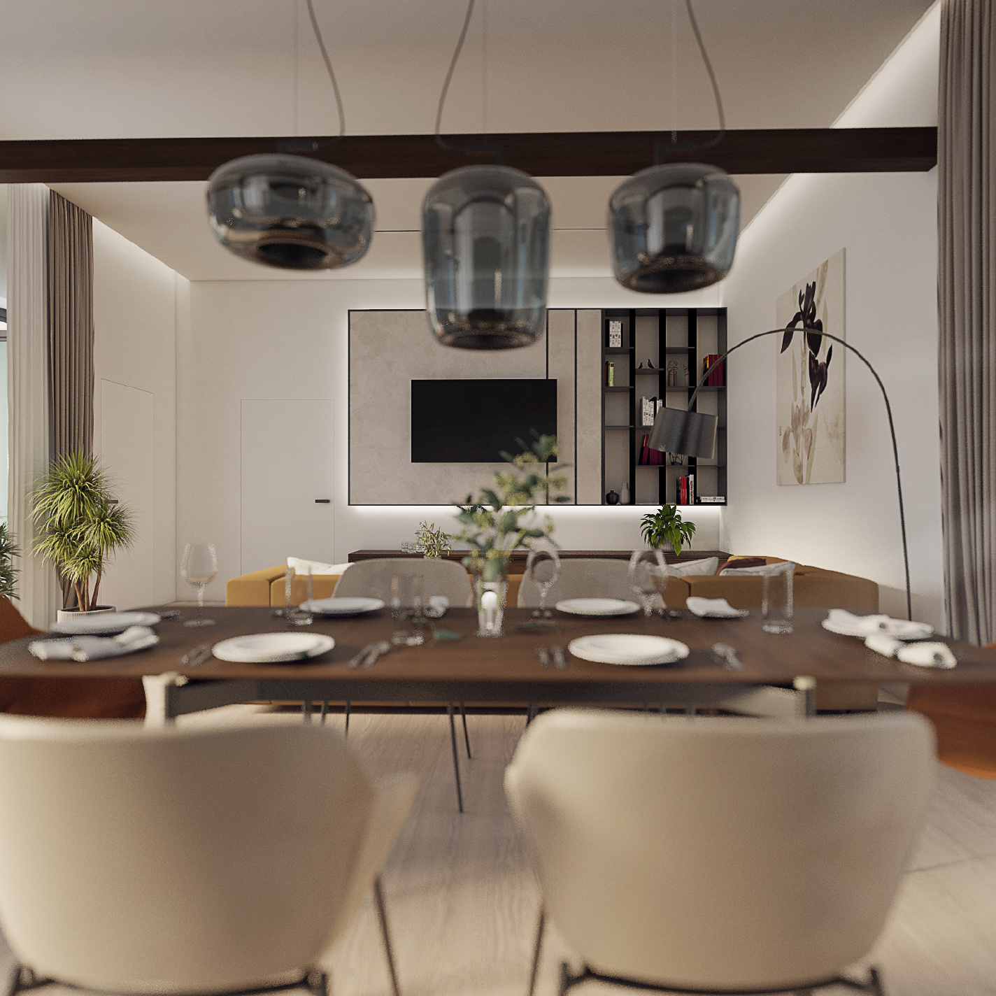 Velkorysý prostor s vysokými stropy měla obsadit kuchyň, jídelna a obývací pokoj. Klientka architektky Alexandry Kaščakové přišla s představou hnědé kuchyně a určila tím barevné ladění celé místnosti. Vzhledem k tmavšímu odstínu kuchyně zvolila architektka světlou podlahu, která prostor rozsvítila. Jednotného působení se docílilo pomocí zemitých odstínů, které si s hnědou kuchyní dobře rozumí, a okrové barvy. Ta se spolu s černou a hnědou stala dominantou prostoru. Namísto původně zvažovaného zakrytí trámů se jejich přítomnost zdůraznila tmavým nátěrem, který nachází odezvu na jídelním stole. O stupínek světlejší dlažba v imitaci kamene se objevuje nejen na lince a obložení krbu, ale také na hodinách vytvářených na míru. Výsledkem je výjimečně elegantní prostor, který působí hřejivým dojmem.
