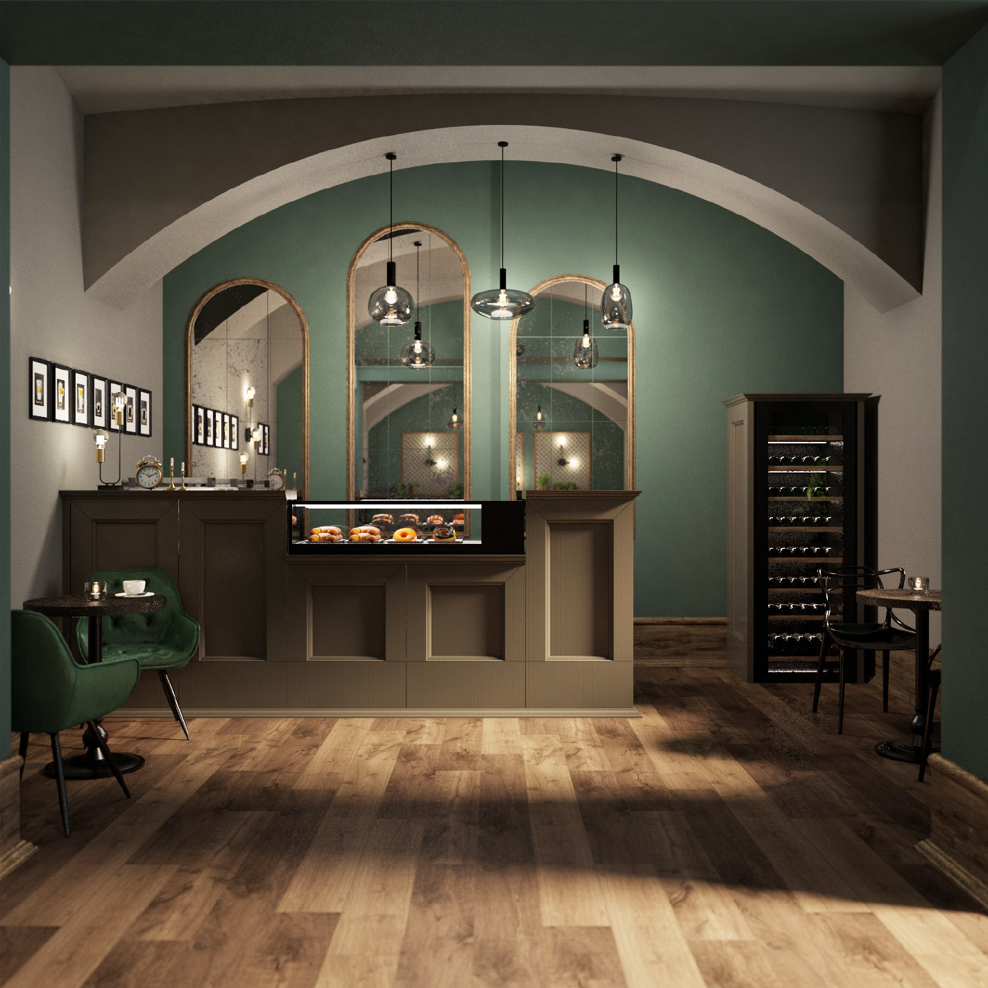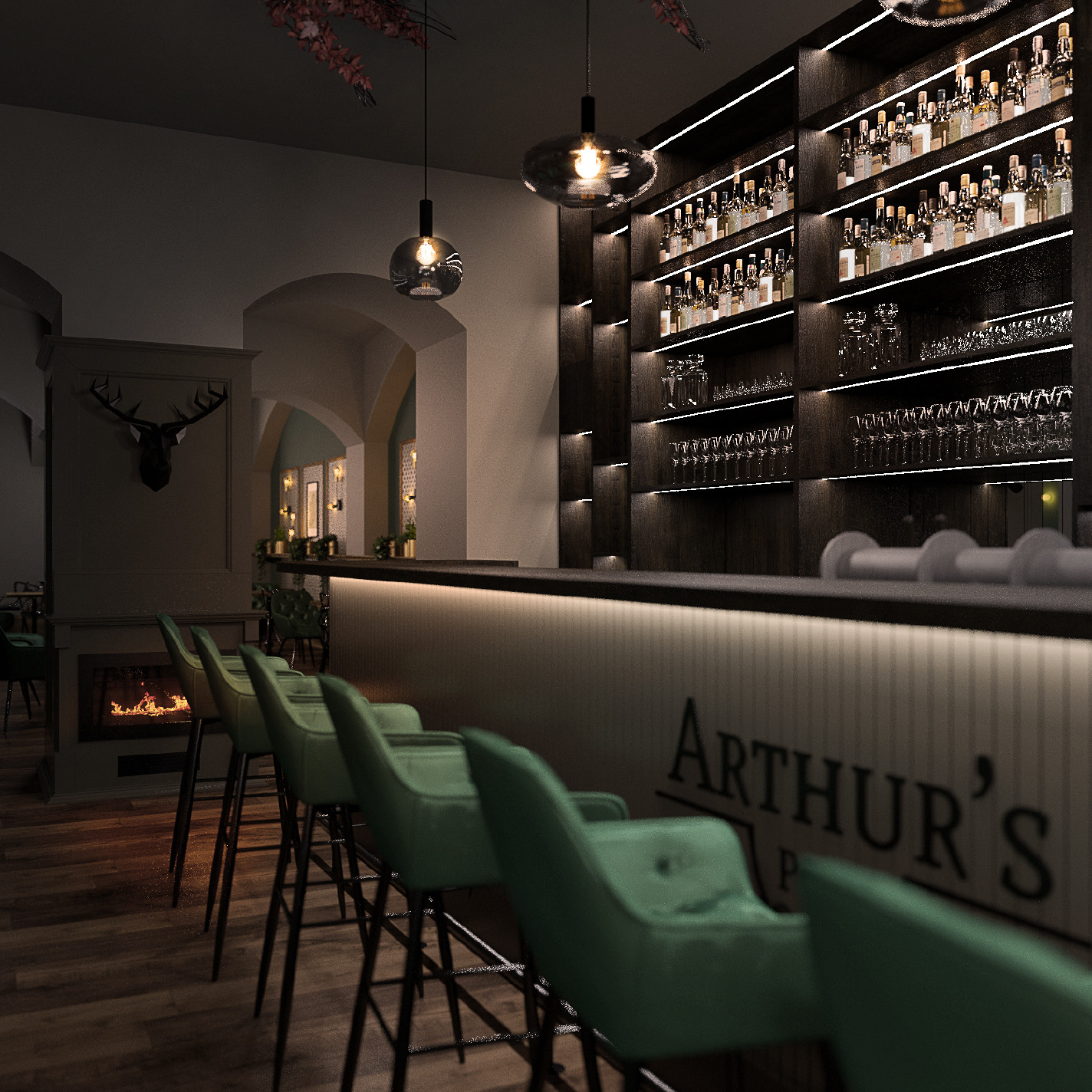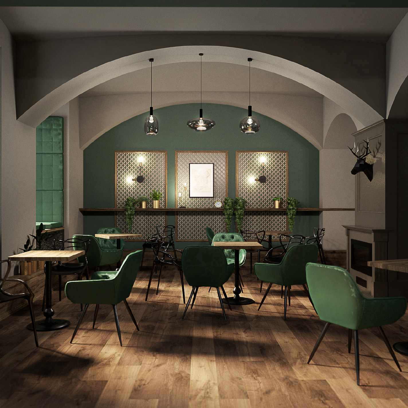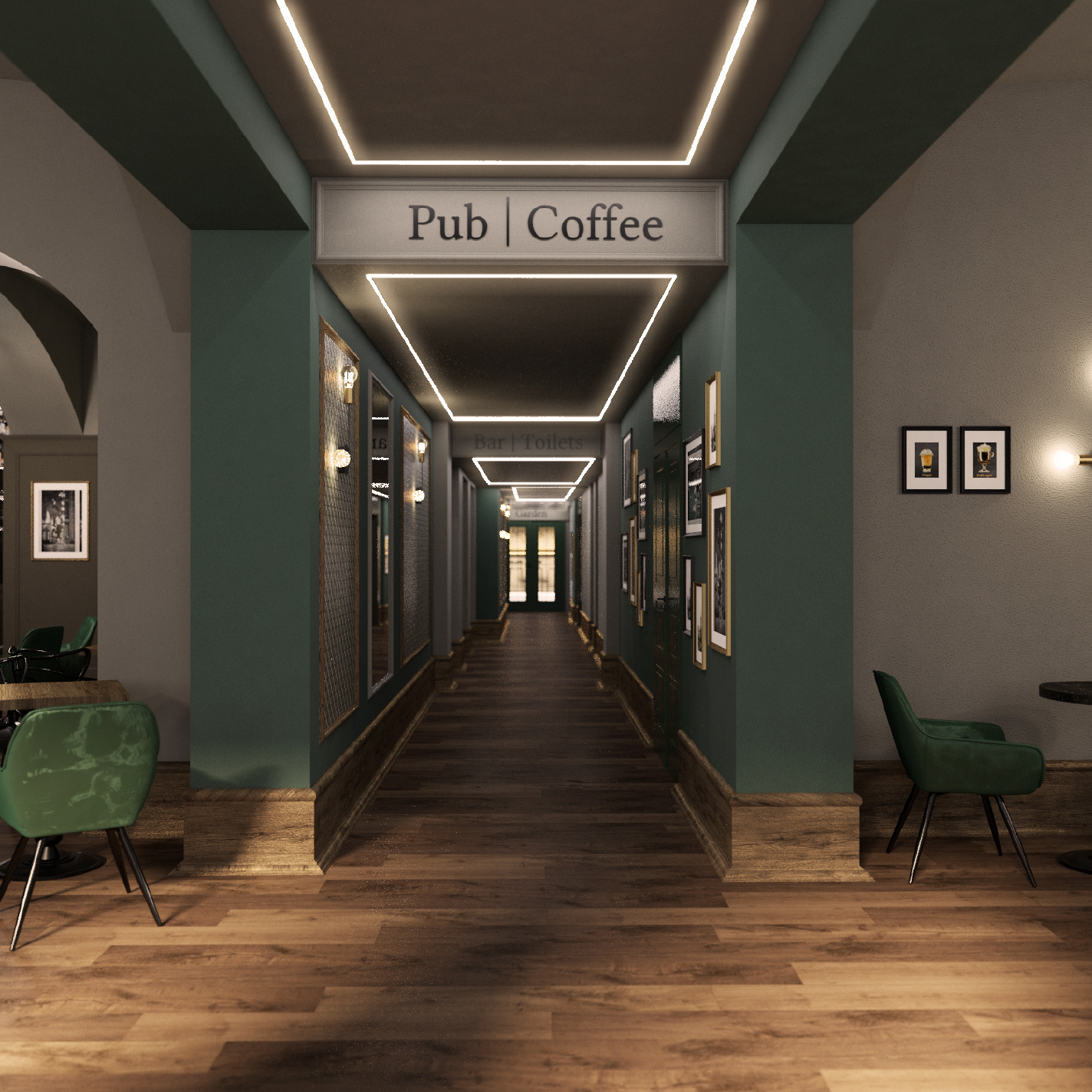 Architekt Jindřich tentokrát musel naskočit do rozjetého vlaku a v mnoha ohledech uhánět směrem, který byl již vytyčen. Práci totiž převzal ve fázi, kdy už byla spousta věcí rozhodnutá a nezměnitelná. Svou pozornost proto plně soustředil na restaurační, kavárenskou a barovou část. Na podlahu umístil keramickou dlažbu ve věrné imitaci dřeva. Důvody pro to byly ryze praktické: dlažba vydrží náročný provoz a snadněji se udržuje. Na stěnách či klenbách se střídají odstíny šedé, které nacházejí odezvu i na truhlářských prvcích. Mezi barvami nemohla chybět zelená. Bez ní by pub snad ani nemohl být irský. Příjemnou atmosféru dotváří závěsná světla z kouřového skla různých tvarů.