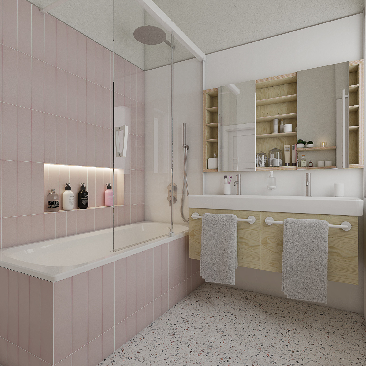 Čistá elegance, světlé odstíny a méně tradiční kombinace barev byla ostatně jedním z požadavků klientů. Vyslyšeli jsme ji za pomoci terazo podlahy, růžového a bílého obkladu a nábytku z březové překližky. Ta kromě obložení skříněk či poliček slouží i jako polopropustná stěna. Vedle zvýšeného pocitu soukromí při používání toalety se postará o to, aby WC nebylo tím prvním, na co člověku padne zrak, když do koupelny vstoupí z jedné z ložnic.