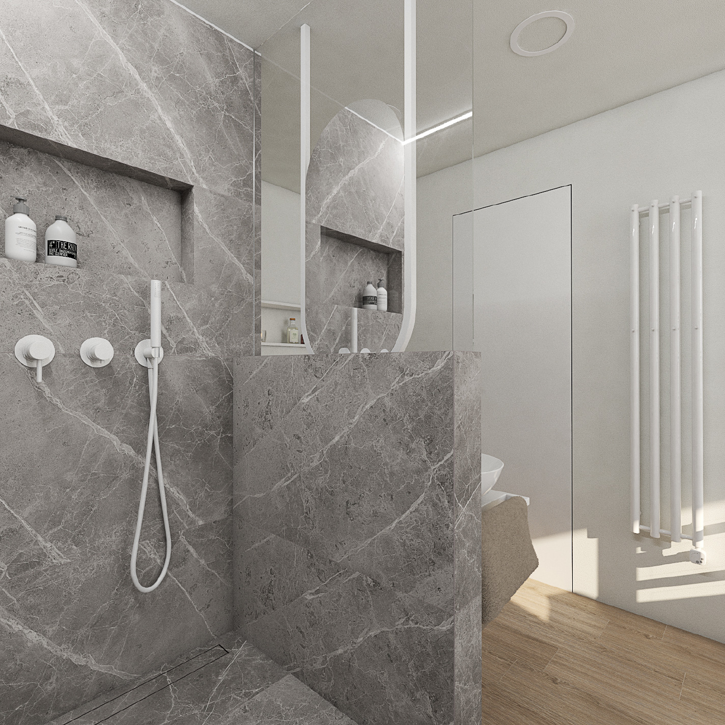 Velkorysého prostoru pro sprchu se docílilo mezistěnou, na jejíž druhou stranu designér zavěsil umyvadlovou skřínku s umyvadlem na desku. Nad ním je od stropu spuštěné oboustranné zrcadlo, ve kterém je tak možné se vidět i během sprchování.