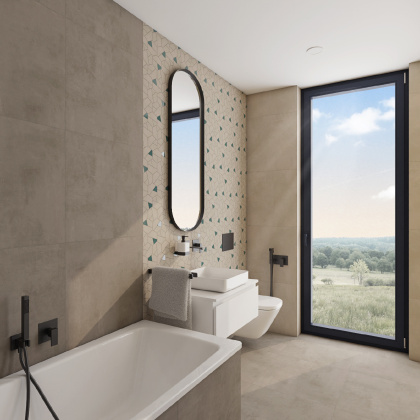 Na umyvadlovou sestavu se mohou klienti dívat při uvolňující koupeli v solitérní vaně, ke které je umístěna velká solitérní vanová baterie s ruční sprchou. Tento pohled mohou zároveň libovolně střídat s pohledem z okna, kde příroda během roku postupně odhaluje všechna svá kouzla.