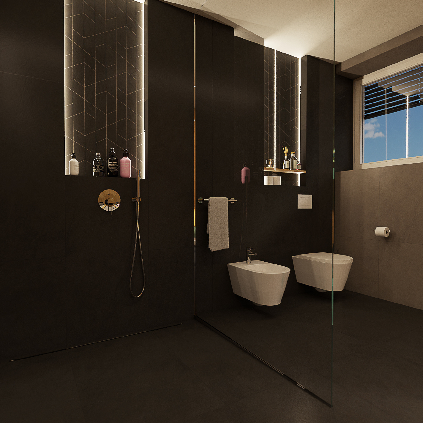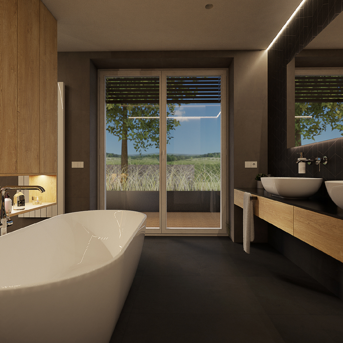 V přední části koupelny najdeme velkorysou odkládací plochu se dvěma umyvadly. Mozaikové obložení za velkým podsvíceným zrcadlem znovu objevíme v nikách v zadní části koupelny. Je ve stejném odstínu antracitové, jako podlaha a část stěn. Ostatní stěny také imitují stěrku, ovšem tentokrát v tmavě béžovém provedení. Tmavé ladění celé koupelny vyvažuje bílá sanita i doplňky, dubový dekor na nábytku, množství LED pásků a především přítomnost opravdu velkého okna.