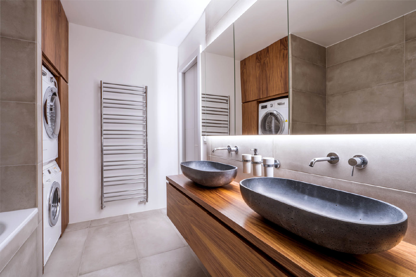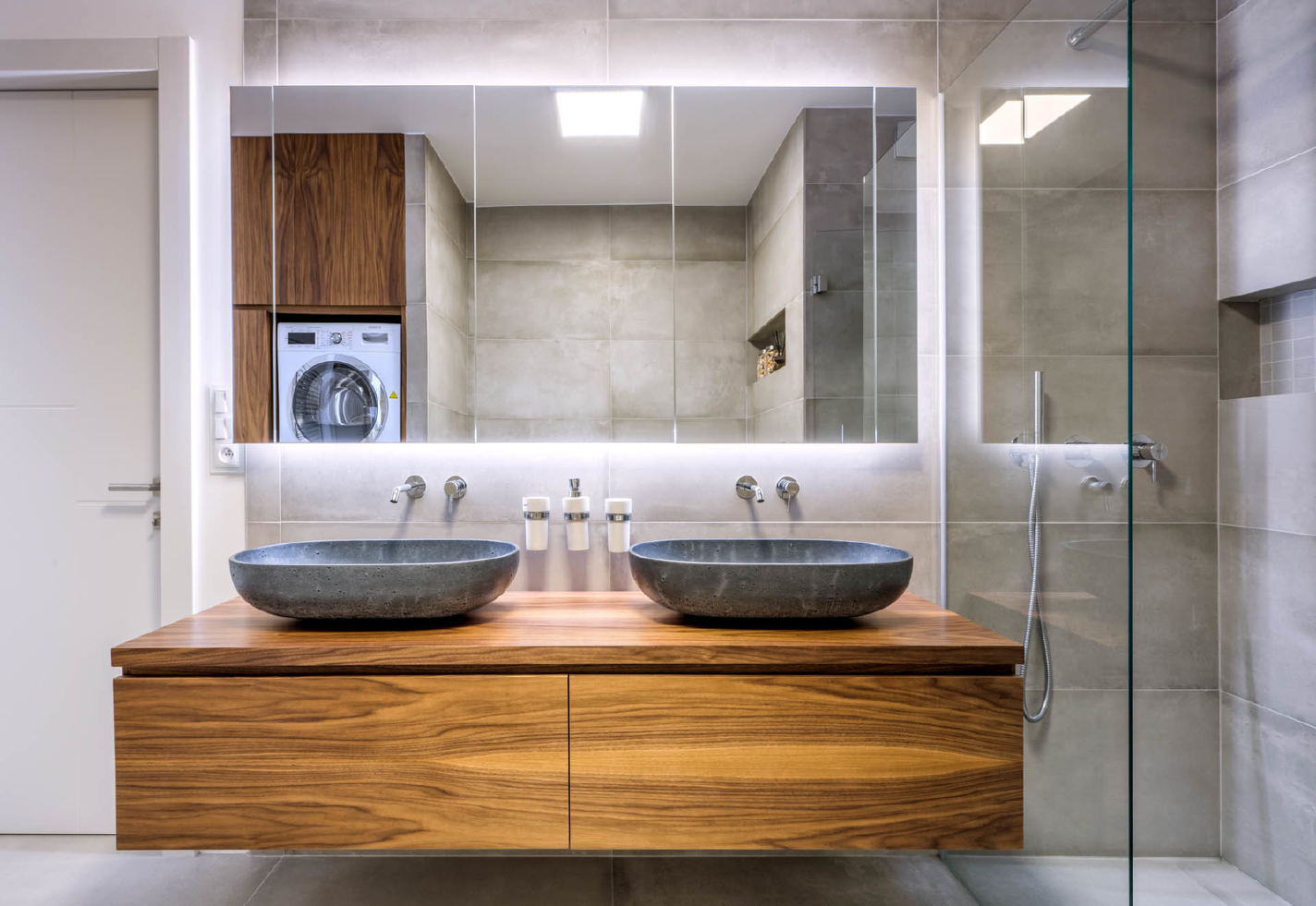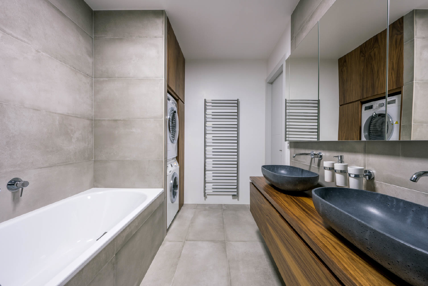 Mezi požadavky zazněla i nutnost umístit do koupelny pračku se sušičkou. Prostor kolem nich využil architekt Jindřich Kobr k poskytnutí velkorysých úložných prostor. Koupelna je díky tomu multifunkční, ovšem především se v ní rodina cítí velmi komfortně. Každá návštěva je totiž připomínkou dobře odvedené práce i kvalitní spolupráce.