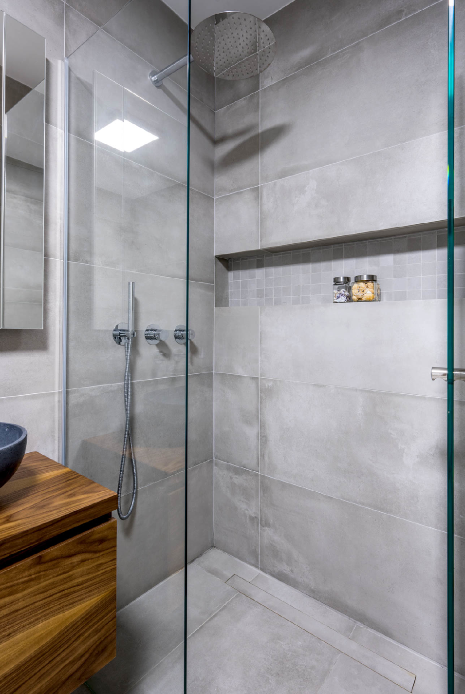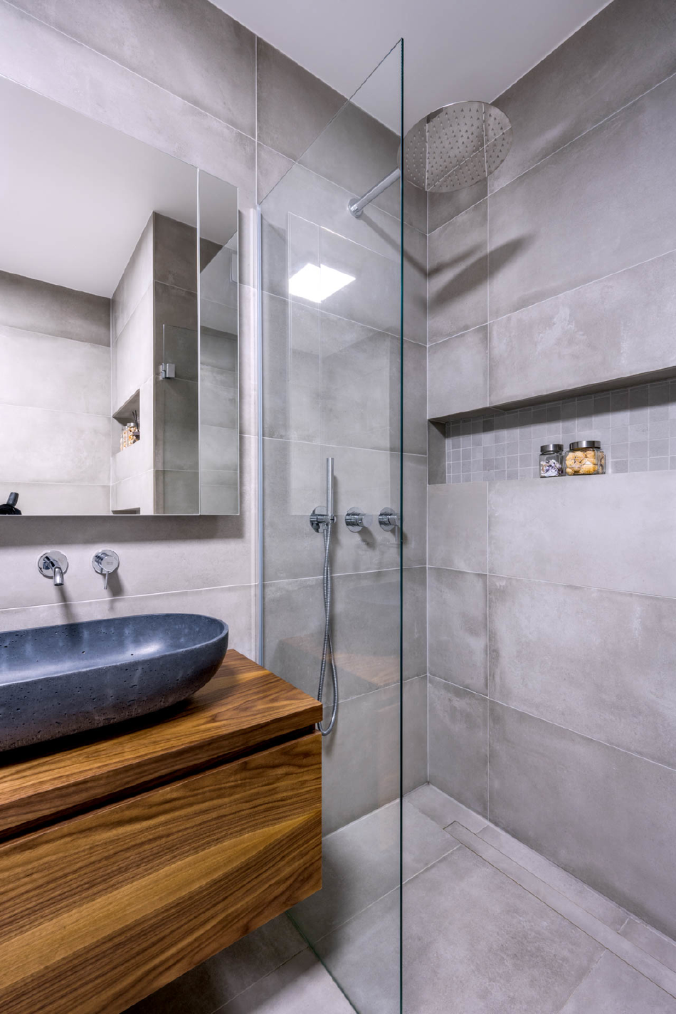 Převážně oválný tvar doplnily praktické čtverhranné niky se stylovým podsvícením. Zabydlela se v nich mozaika, která tak narušuje masivní šedé plochy.