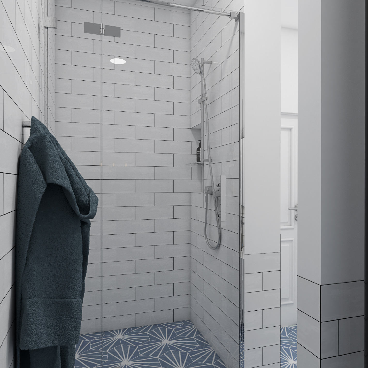 Toaleta a sprcha získaly samostatné místo na stupínku za rohem, aby vznikl větší pocit soukromí. Jejich poznávacím znamením jsou chromové prvky na zástěně i bateriích a bílá barva. Ta nachází prostor i na stěnách v podobě psaníčkového obkladu, který je zvýrazněný černou spárovací hmotou.