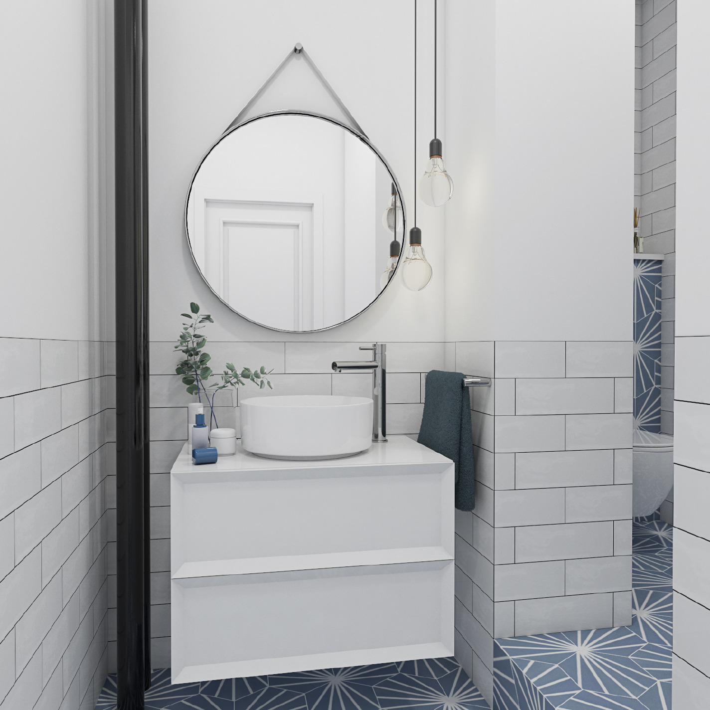 Koupelna musí dávat smysl. Občas se to však neobejde bez úpravy dispozic. Novým uspořádání prostoru docílila architekta Alexandra Kaščaková toho, aby se nejčastěji používaná část koupelny stala lépe přístupnou. Jde o mycí zónu s kruhovým umyvadlem na desku, které doplňuje vysoká stojánková baterie. Umyvadlo vévodí koupelnovému nábytku v retro stylu. Retro styl však koupelnu vystihuje jen částečně. Celkově koupelna ladí s moderním interiérem zbytku bytu.