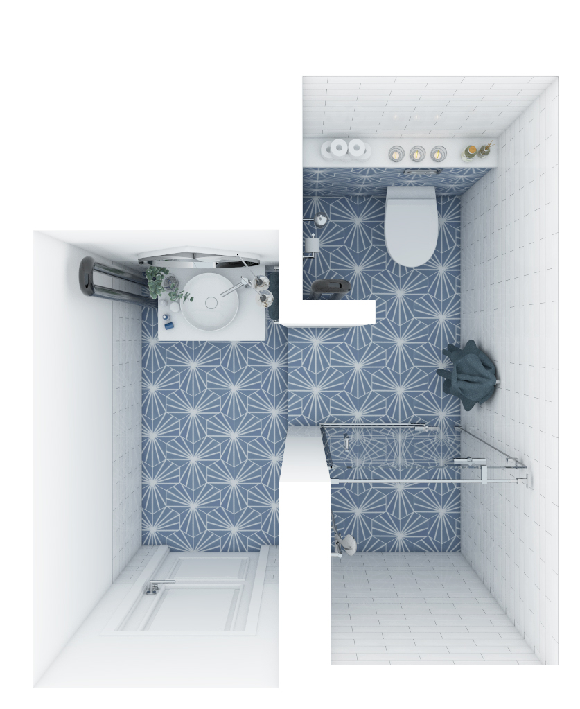Podlaha obou částí a zeď za toaletou vytváří paprsky. Vděčí za ně speciální hexagonální dlažbě, kterou je možné do efektních paprsků vyskládat.