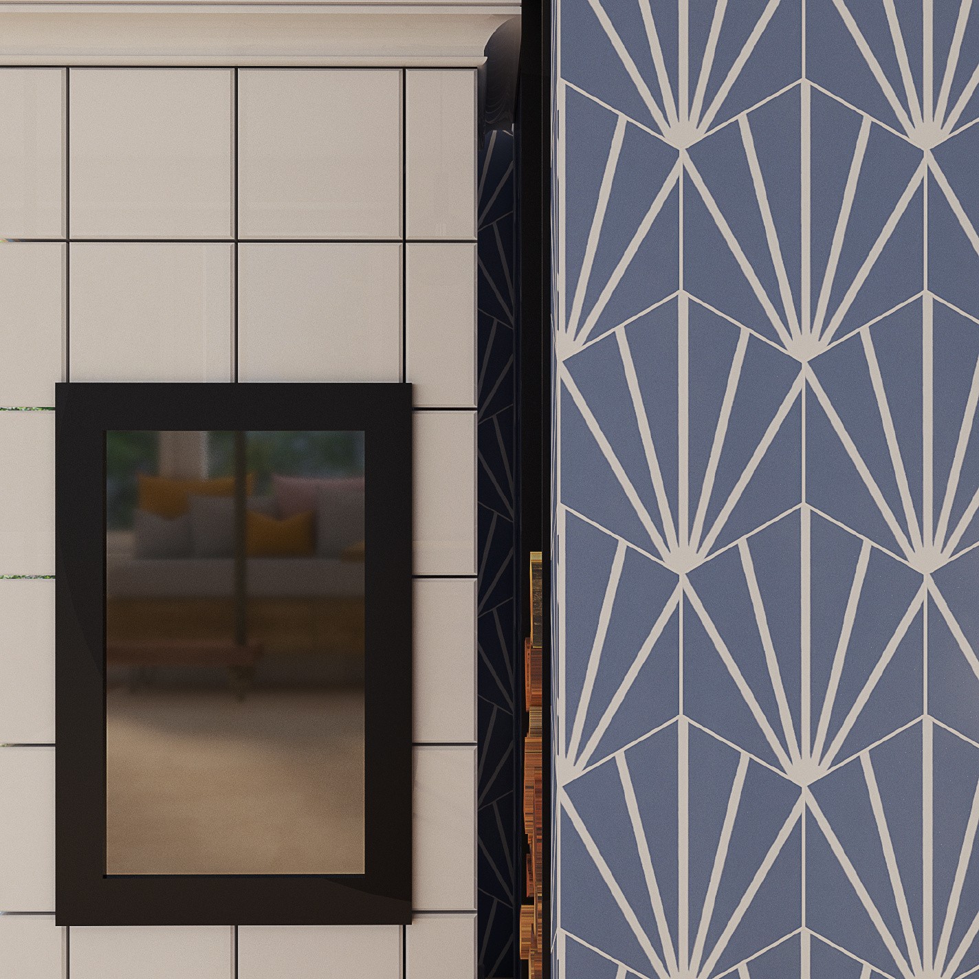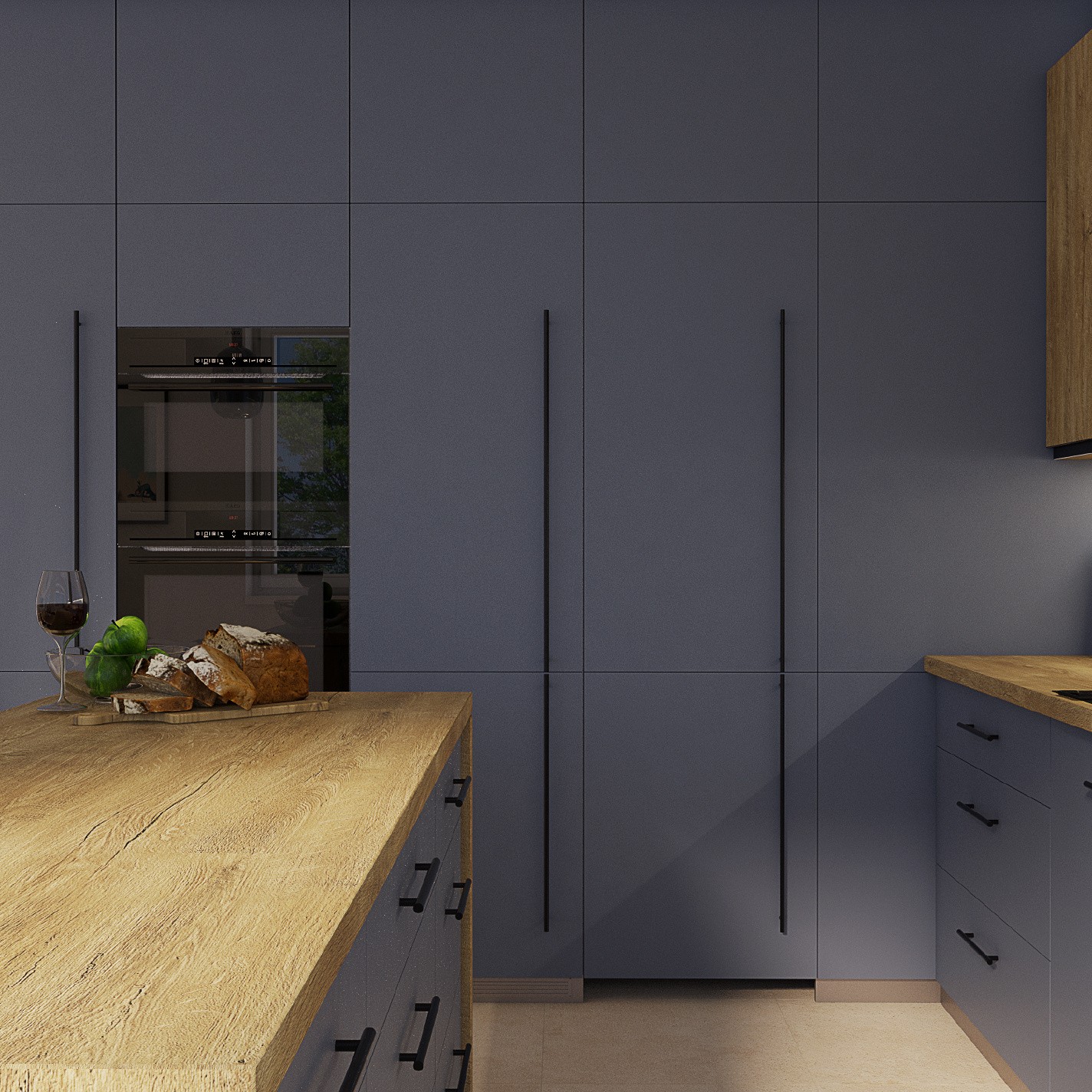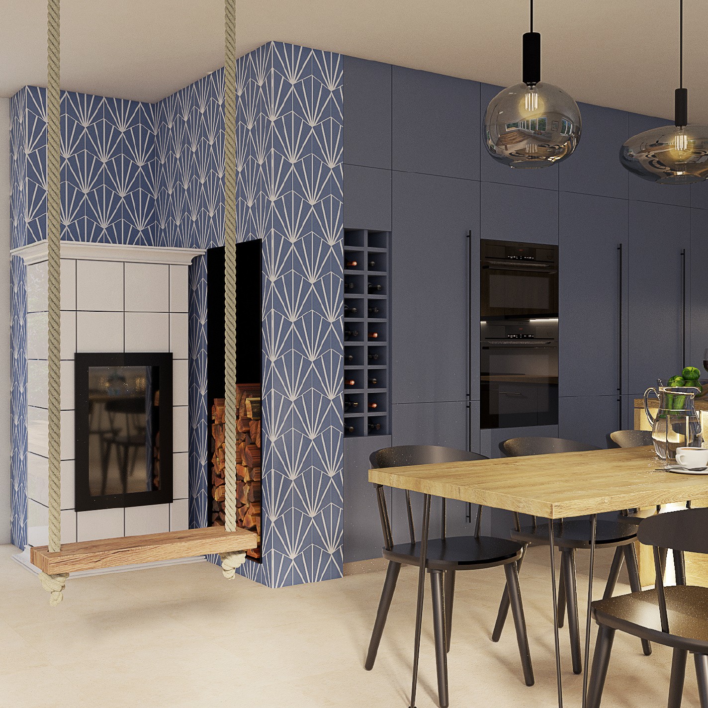Návrh kuchyně navazoval na návrh koupelny. Ta se klientům natolik líbila, že chtěli v tomtéž duchu pokračovat. Jedním z požadavků, který architekt Jindřich Kobr naplno vyslyšel, bylo použití modré barvy. Ta v kuchyni dominuje. Doplnilo ji pouze dřevo horních skříněk i ostrůvku a písková dlažba. Navazující stěna získala obklad ve tvaru hexagonu s paprskovitým efektem. Do přilehlé niky je možné uložit značnou zásobu dřeva pro velká kachlová kamna. Výrazným prvkem kuchyně je houpačka, kterou si klienti velmi přáli. Její uzly podtrhují přímořský styl, který je pro celou kuchyni typický. Spotřebiče, židle, trnože, úchyty či světla jsou v černém provedení. Kontrast barev je o to výraznější.