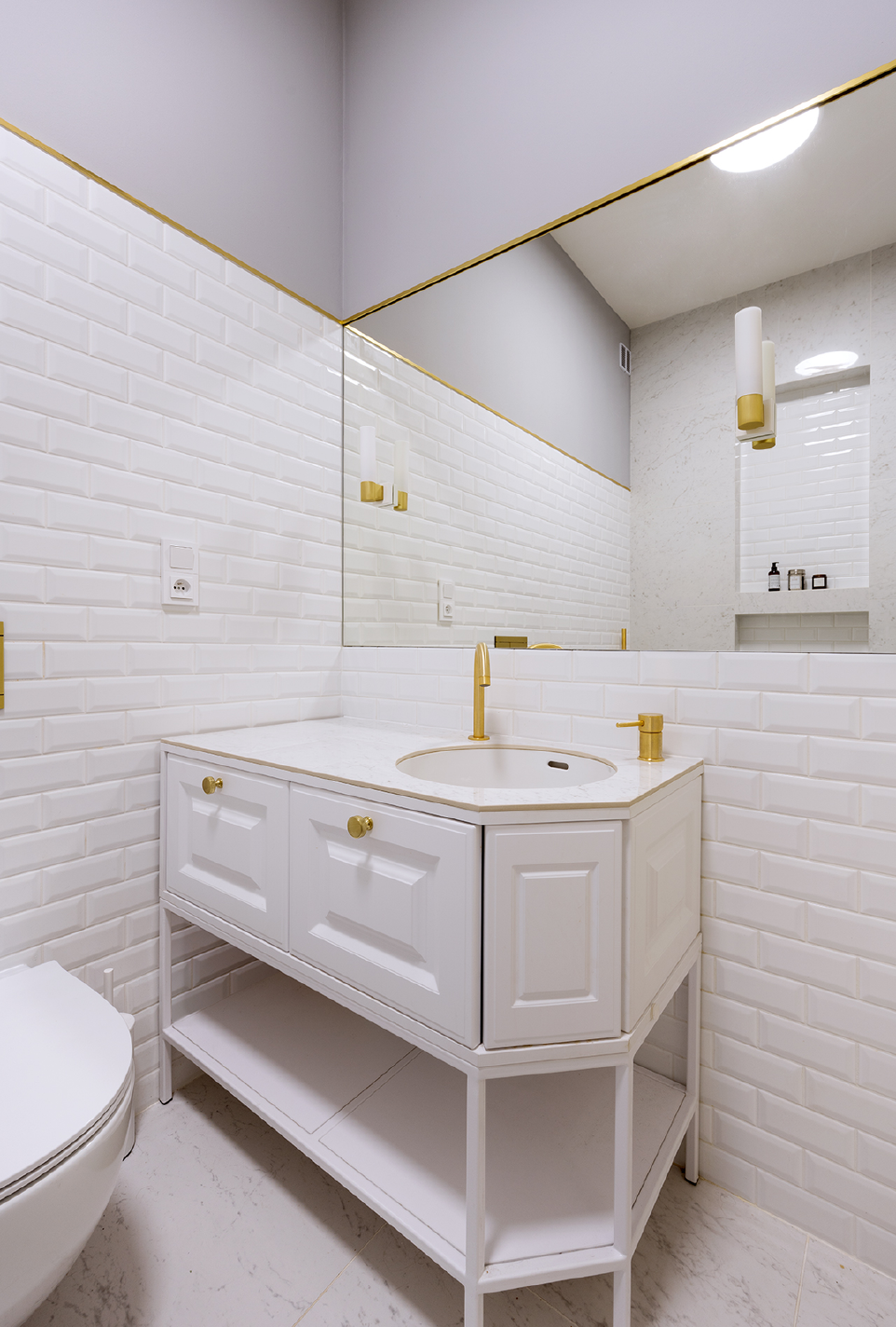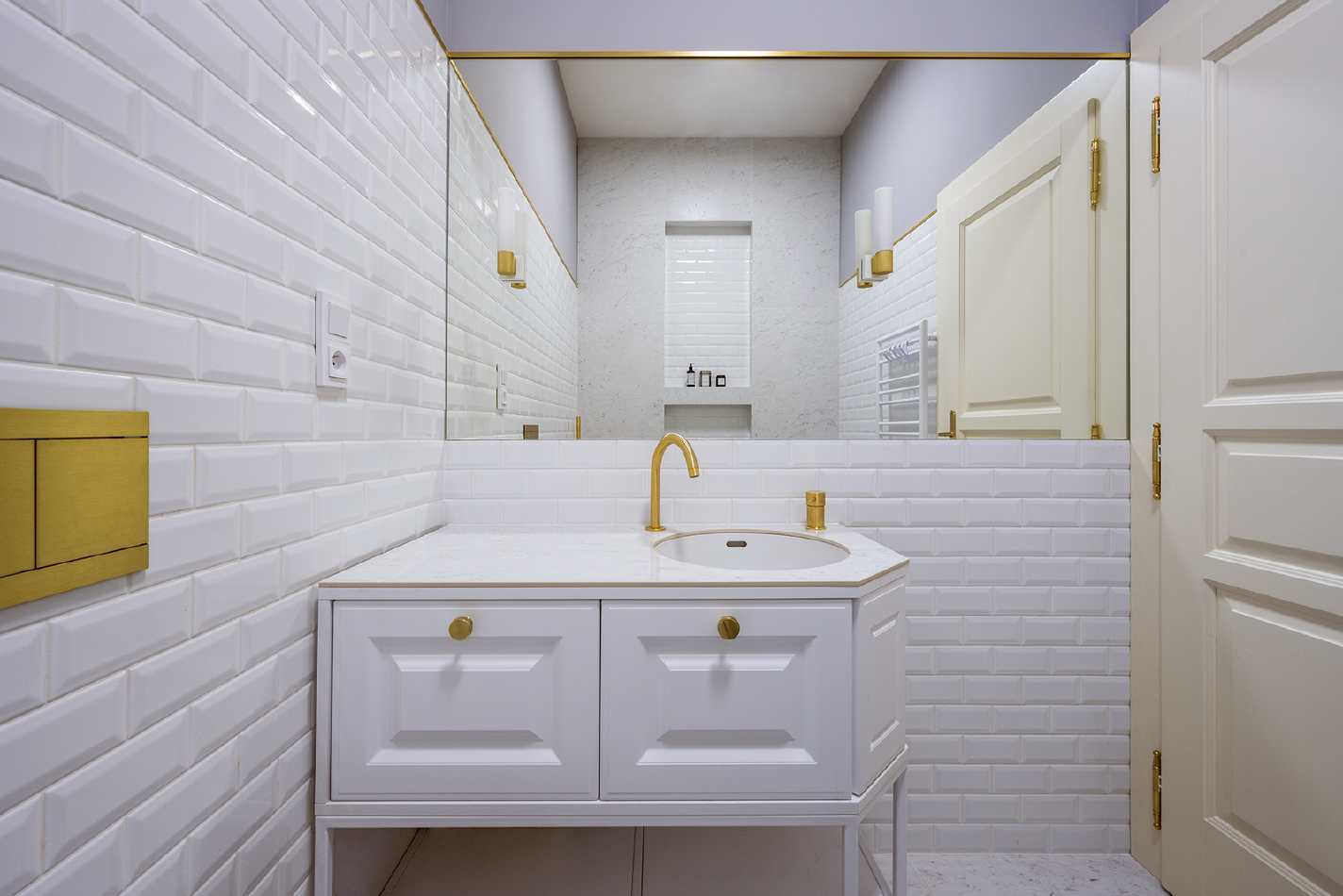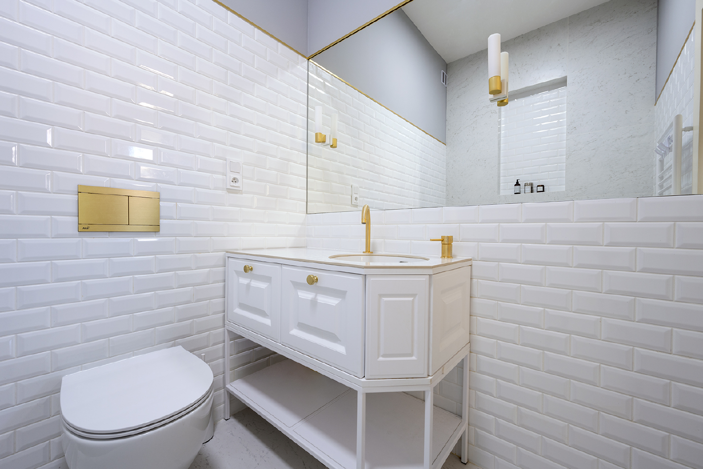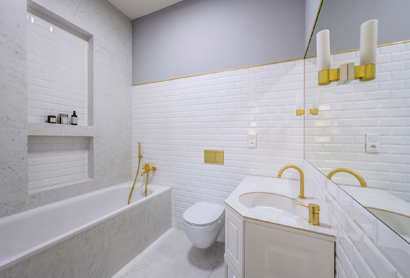 Zlaté detaily najdeme všude, kde to dává smysl. Vedle umyvadlové i vanové baterie například na ovládání od WC, na liště, která odděluje dlažbu od výmalby, na klice či na nábytkových úchytkách.