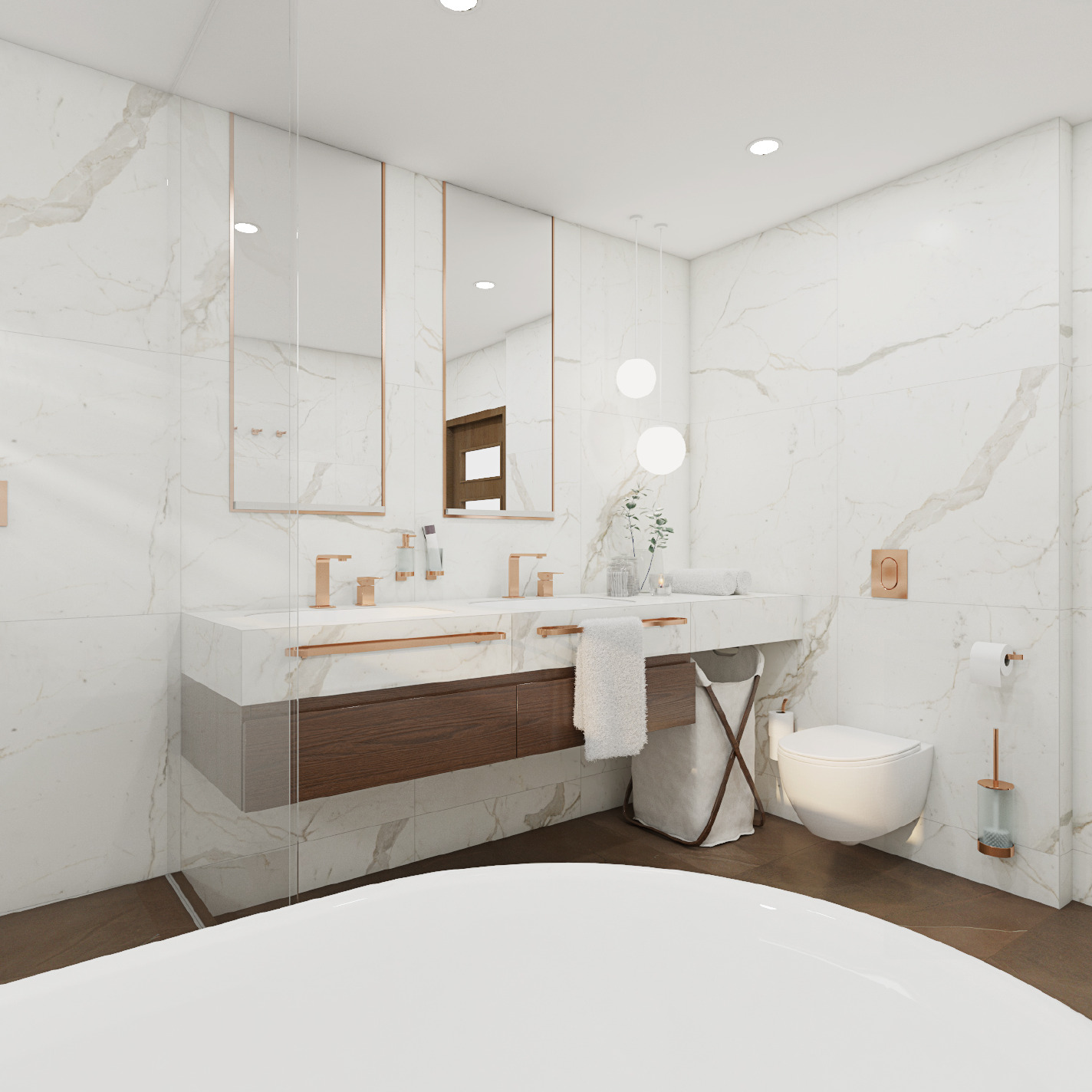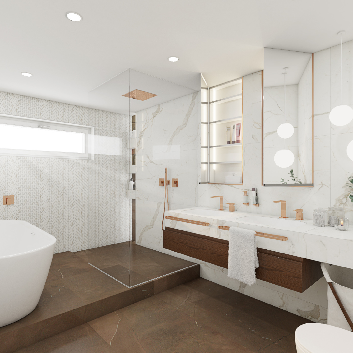Design kombinuje světlou dlažbu s imitací mramoru na stěnách s hnědou dlažbou ve stejném dekoru, která pokrývá podlahu a zadní stěnu sprchové niky s řadou polic. Zeď za solitérní vanou ozvláštňuje mozaika. Vše korunují baterie, doplňky a orámování zrcadel z lesklého růžového zlata.