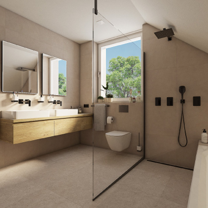 Největší plochu stěn pro sebe zabrala dlažba v imitaci mramoru. Právě na ní nejlépe vyniknou baterie a doplňky z růžového zlata, které podtrhují luxusní ráz koupelny.