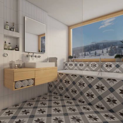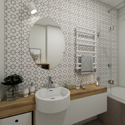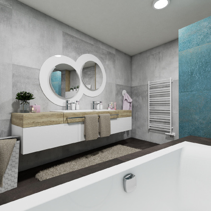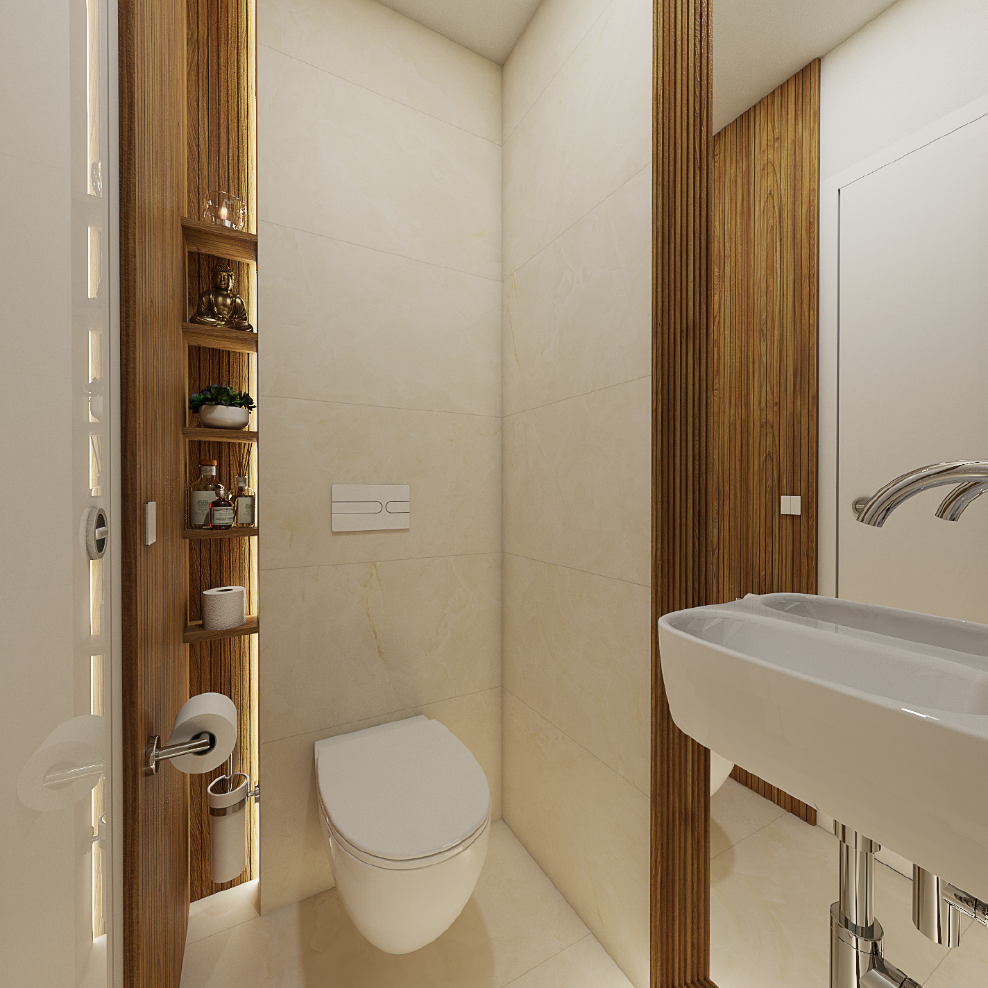 U této toalety bychom měli zdůraznit písmenko „L“. Právě to se stalo jejím klíčovým prvkem. Jednotlivá „L“ se vzájemně protínají a doplňují. Nejvýrazněji je to patrné na dřevěném obložení a také na obou křídlech zrcadel, které prostor opticky zvětšují.