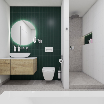 Místo toho designér Jindřich Kobr zasadil koupelnu citlivě do kontextu celého domu. V něm má své výsostné postavení beton, tmavé barvy a vedle toho barva petrolejová. Právě ta se stala rozjasňujícím prvkem celé koupelny. S její pomocí byla vytvořená stěna, která odděluje toaletu od vany. Z vany díky tomu vznikl jakýsi „sochařský“ prvek v prostoru. Stylové podsvícení působí hřejivě, i když se člověk zrovna nekoupe.