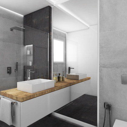 Dominantou celé koupelny se stalo velké podsvícené kruhové zrcadlo na míru a umístěné na stěně z dřevodekorované dlažby Hamptons Teak španělské značky Durstone. Dlažbu Haptons zvolila Simona jako protipól k jinak industriálně působící dlažbě Minimal grafit.