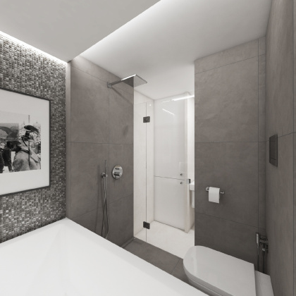 Při návrhu této koupelny pro mladý pár byl největší výzvou relativní nedostatek prostoru. Vzhledem k důrazu na minimalistický design celého bytu se ale vše podařilo skloubit i bez ústupků vůči funkčnosti. V koupelně tak její majitelé najdou nejen prostor pro běžnou hygienu, ale i vanu s integrovaným sprchovým prostorem a navíc jsou do celého prostoru integrovány pračka i sušička.