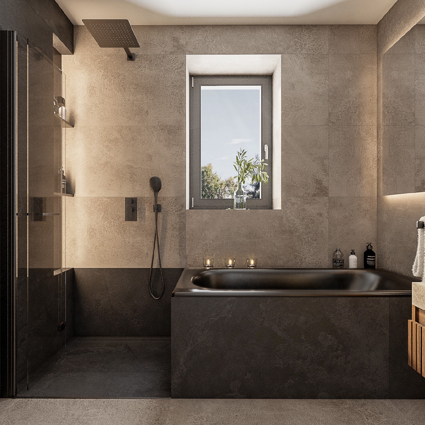 Za dominantní prvky označuje architektka koupelny Alexandra Kaščaková spárořez a práci s osvětlením, které je při práci s černou velmi podstatné. Celkové ladění koupelny je moderní a luxusní, ale koupelna přitom stále zve k příjemnému uvolnění.
