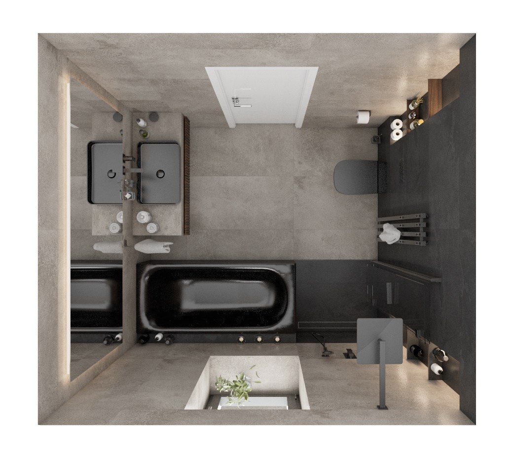 Toaleta získala skryté místo za dveřmi, čímž se výrazně zvýšil pocit soukromí. Kromě sanitární keramiky padla volba na černou barvu i při výběru baterií, doplňků a radiátoru.