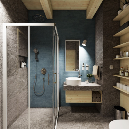 U domu dominuje cihlové obložení a zelená plechová střecha. Tytéž prvky proto promítl i do svých návrhů. Obložení ve sprchovém koutě se sedátkem cihly skutečně připomíná. Sedátko ve sprše, o které klienta velmi stála, vzniklo pomocí niky. Vedle pohodlí při sprchování může sloužit i jako praktická odkládací plocha. Cihlové obklady nakonec vytvořily jakýsi pruh, který určuje prostor mokré zóny.