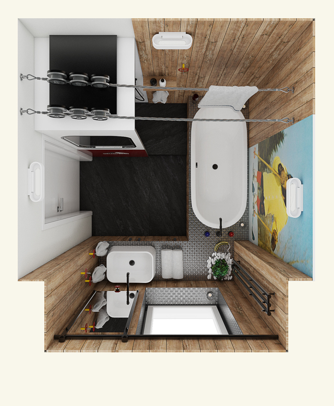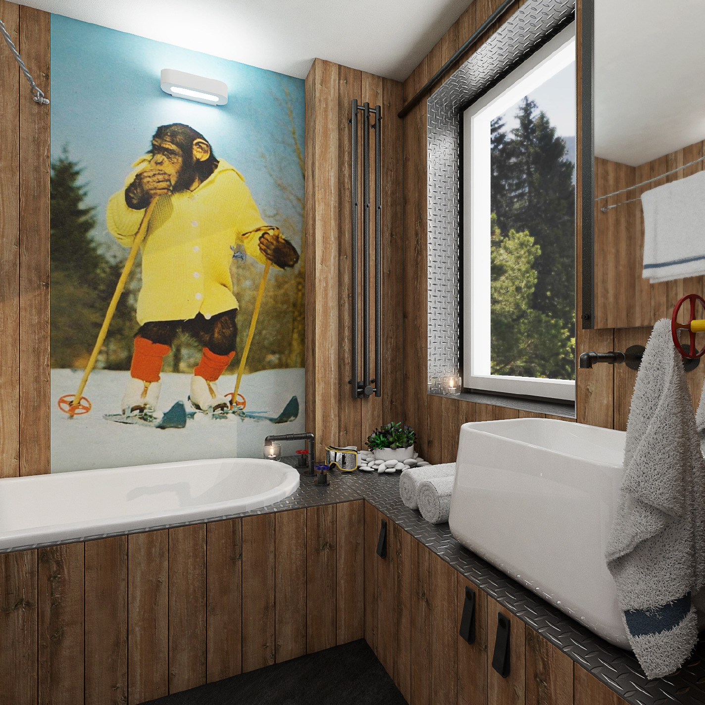 Ústřední motiv opice na lyžích byl daný. Designér k němu přidal spoustu nápadů, aby byl výsledný dojem co nejpůsobivější. Odkládací plochu i prostor kolem vany Ambiente tvoří slzičkový plech, jaký známe ze schodů v lyžařských areálech. Na něj Jindřich umístil vysoké umyvadlo, které bylo jedním z mála požadavků.