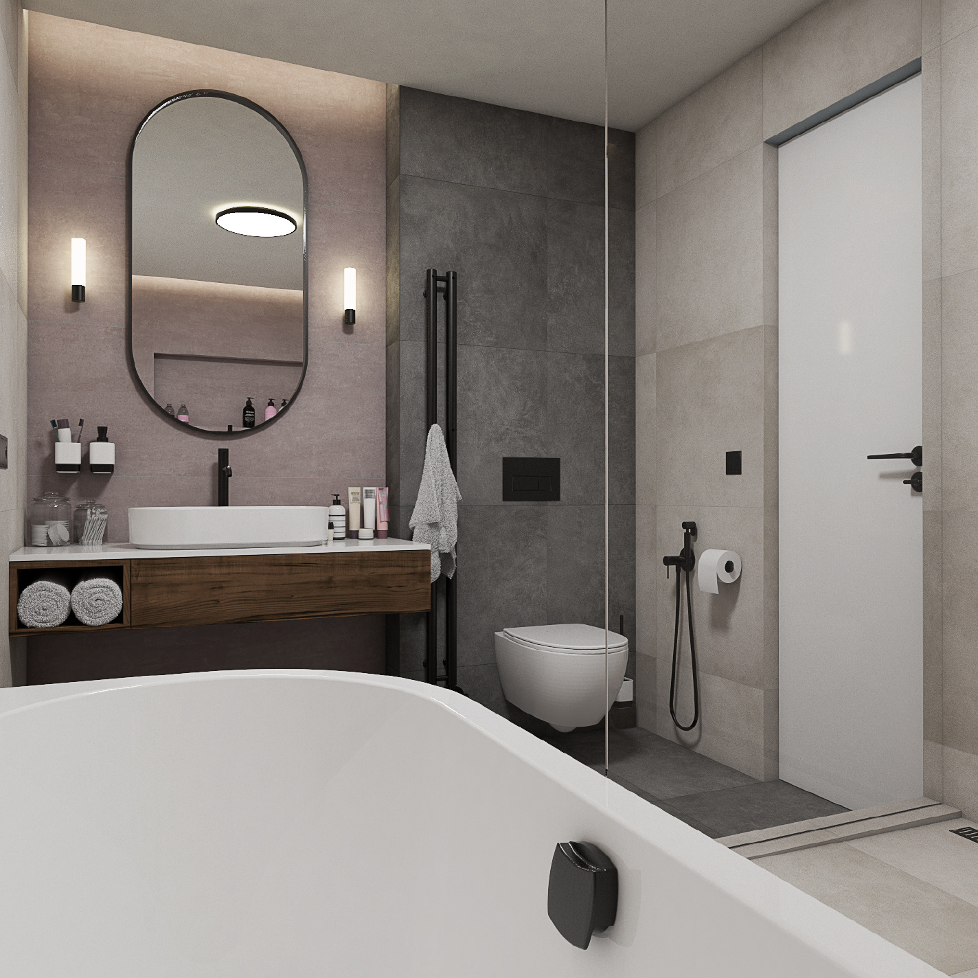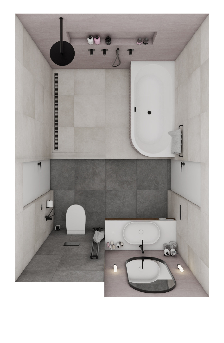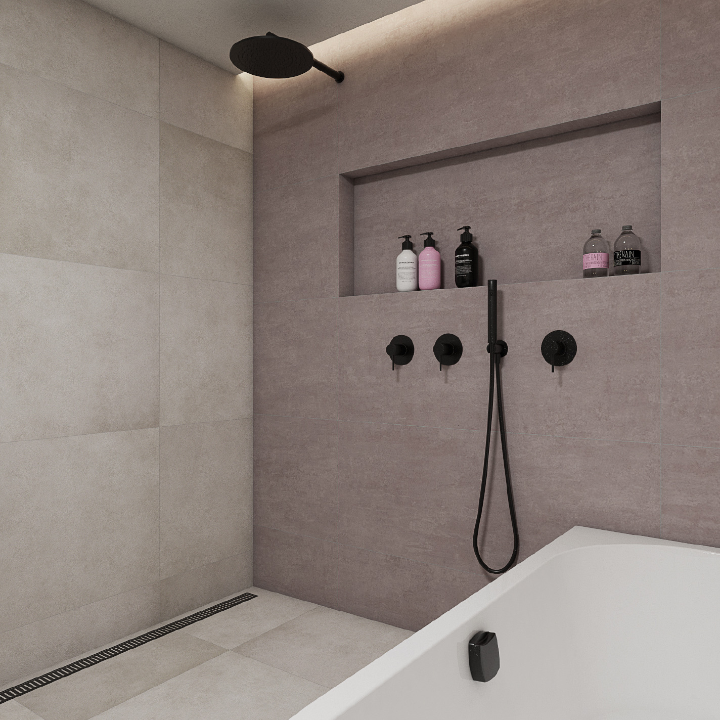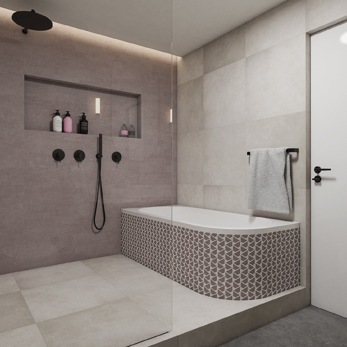 V koupelně, která slouží výhradně dámám, se podařilo sladit růžový nádech s industriálním stylem, který má klientka ve velké oblibě. Dveře, které vedou na opačných stranách, tvoří přirozený řez mezi mokrou a suchou zónou. Ve vyvýšené mokré zóně najdeme prostornou sprchu se zástěnou a vanou s působivým mozaikovým obkladem. Dlažba tu získala světlý nádech.