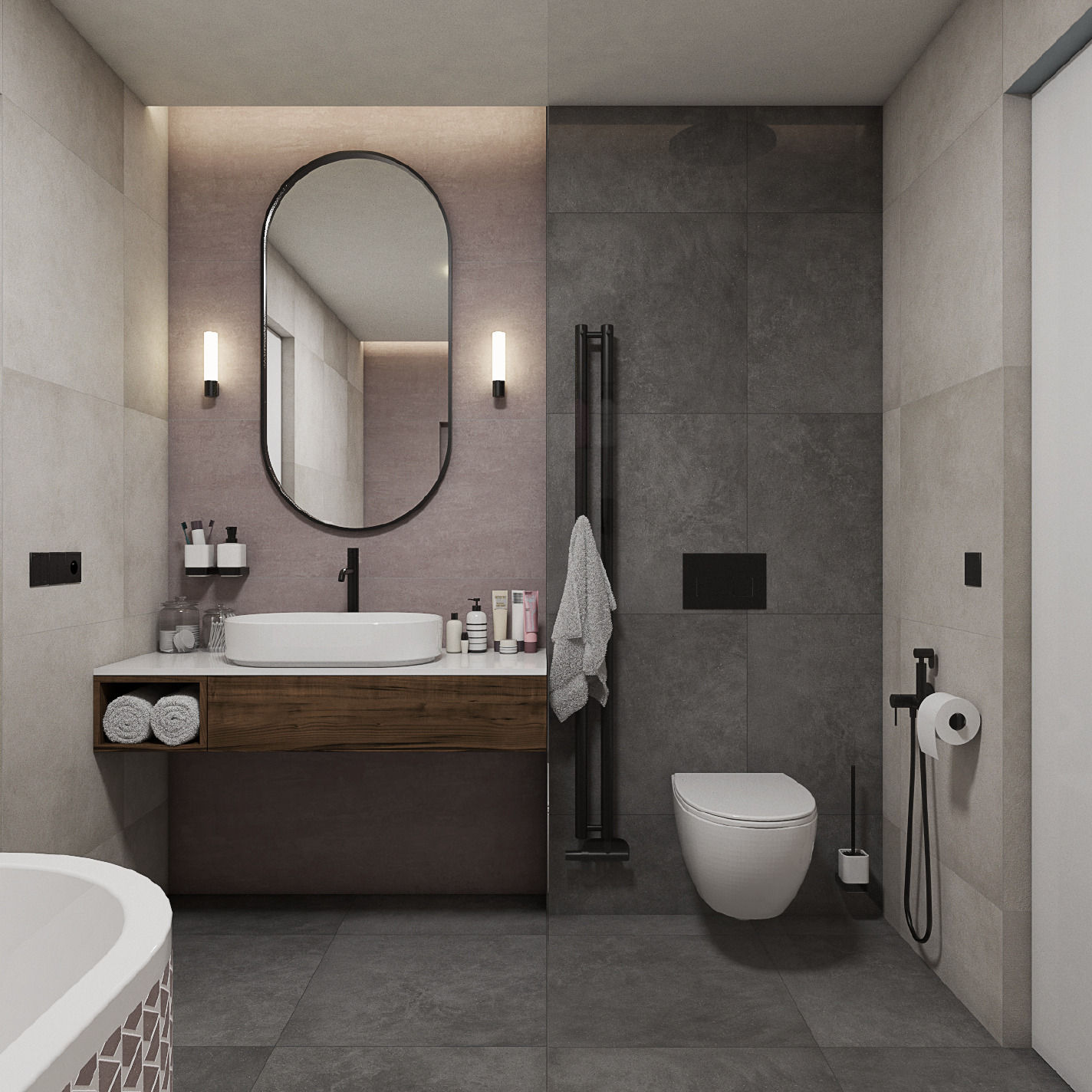 Podlahu a prostor za toaletou v suché zóně definuje tmavší dlažba. Pro stěnu za velkorysým umyvadlem na desku a protilehlou zeď v mokré zóně zvolil architekt Jindřich Kobr růžový obklad se stejným industriálním dekorem, jaký najdeme na ostatní dlažbě.