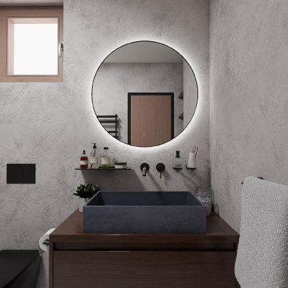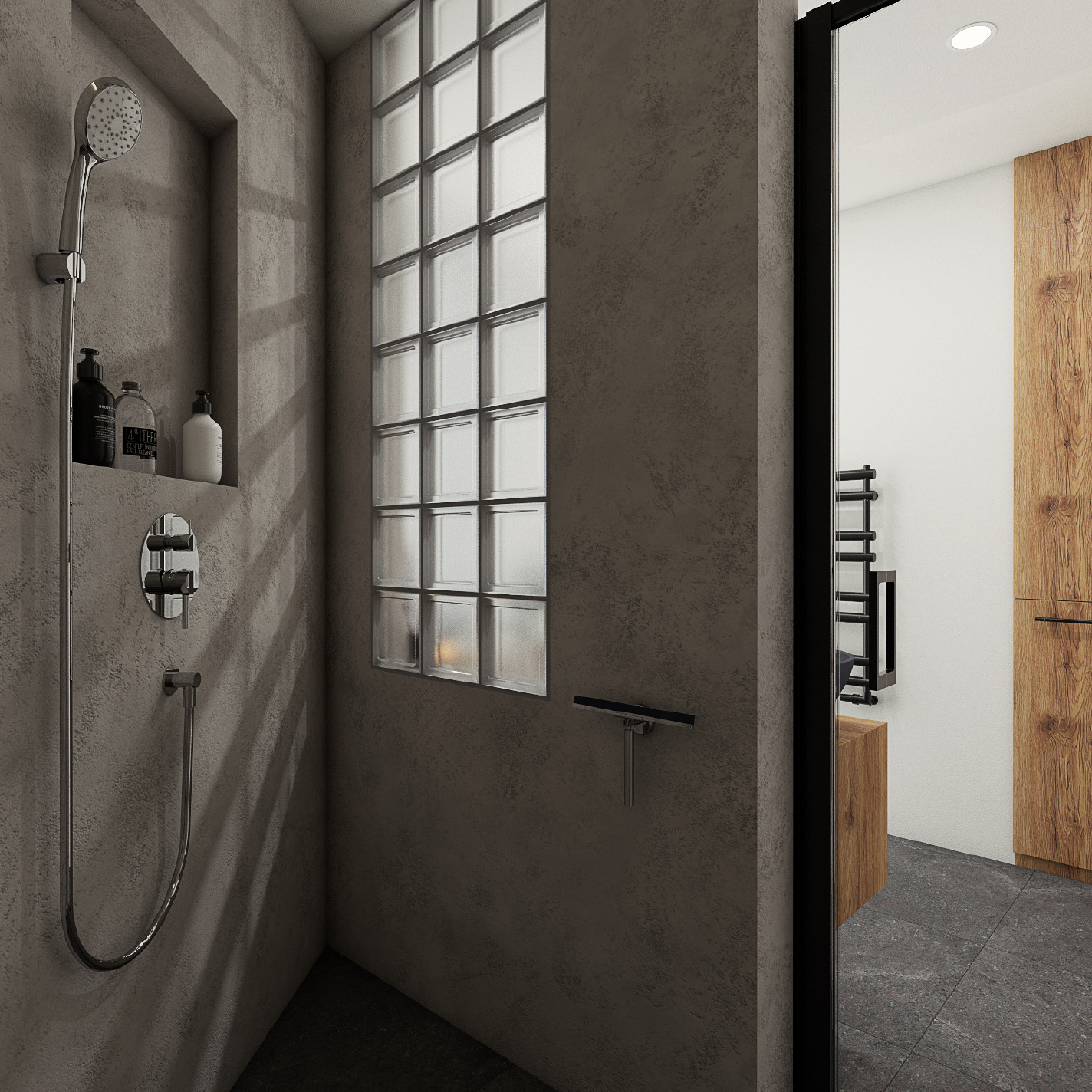 Prostoru dominuje imitace betonu a šedavé odstíny, jejichž jednotu narušuje přírodní dřevo. Černé detaily v podobě radiátoru, orámování zrcadel či sprchové zástěny přidávají poslední barevný prvek.