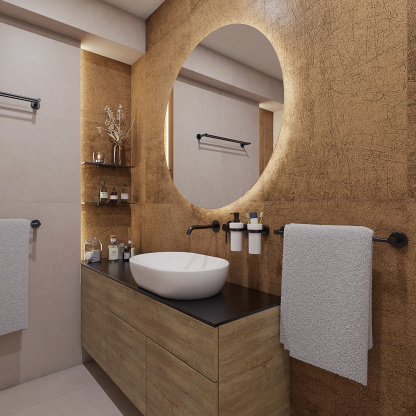 Kombinace béžového obkladu a dlažby v hořčičném odstínu vytváří hřejivou atmosféru, zatímco černé doplňky dodávají koupelně moderní šmrnc. Výrazná dlažba se stává designovým prvkem, který prostoru dodává osobitý charakter. Jemné LED osvětlení v nikách a za zrcadlem vytváří útulné večerní světlo a promění koupelnu v příjemné místo pro relaxaci.