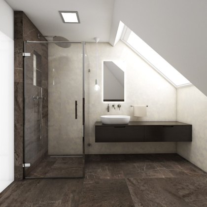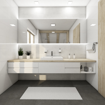 Pro možnost vytvoření maximálně příjemné a relaxační atmosféry je koupelna navíc vybavena podsvíceným zrcadlem a LED pásky zapuštěnými v podhledových kapsách stropu.