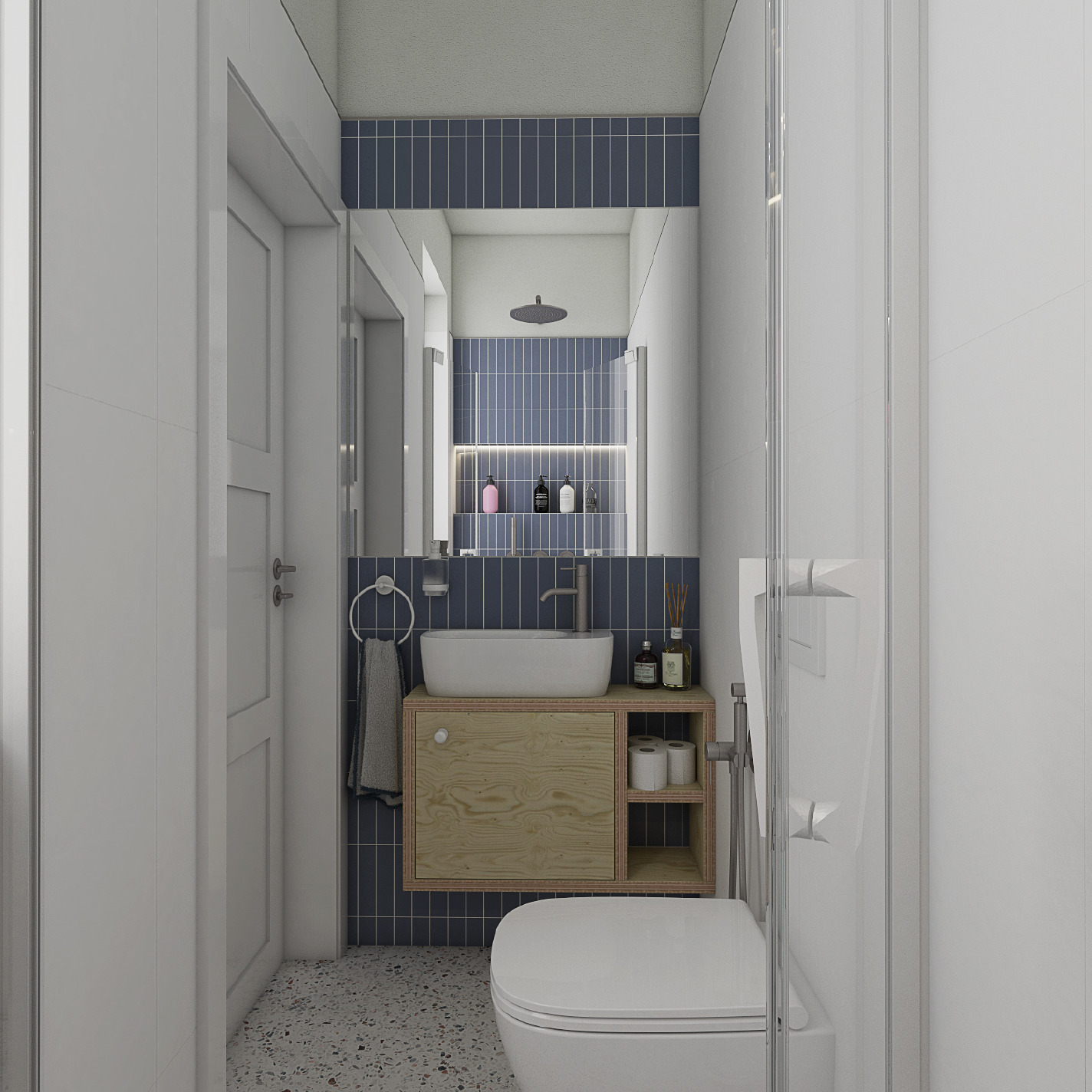Vměstnat umyvadlo včetně skříňky, plnohodnotnou sprchu, toaletu včetně povinné ochranné zóny a bidetové spršky do 2,4 m2 se na první pohled zdálo jako nadlidský výkon. Architekt Jindřich Kobr to ostatně okomentoval slovy, že jde o nejmenší koupelnu, jakou kdy navrhoval. Vzhledem k tomu, že si zpravidla dokáže poradit v každé situaci, nakonec se mu podařilo do prostoru umístit vše potřebné.