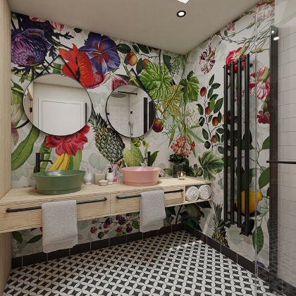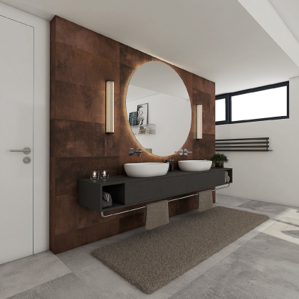 Inspiraci okolní krajinou prozrazuje nepravidelnost a jedinečnost, která je pro přírodu tolik typická. Nepravidelně je položená dlažba i další prvky zařízení. Jedinečnost můžeme najít třeba na betonovém umyvadle, položeném jak jinak než nepravidelně, na světlé, dřevěné desce. O jeho chod se stará baterie v matné černé, která je pro celý prostor typická.