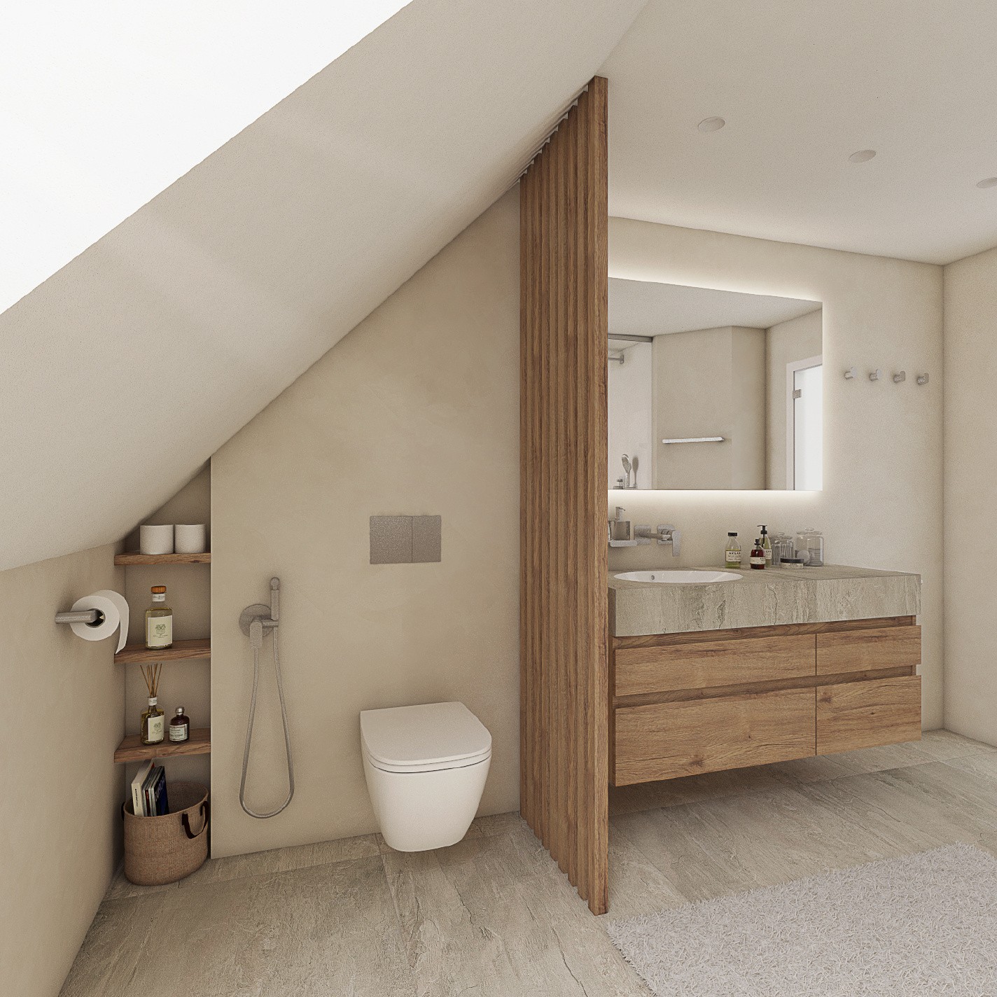 Suchá zóna naproti dveřím nabízí překvapivě dostatek soukromí. Zajišťuje ho stěna z dřevěných lamel, která odděluje toaletu od umývací části. Do rohu místnosti u toalety přibyly praktické poličky. Další úložný prostor poskytuje soustava šuplíků pod zápustným umyvadlem.