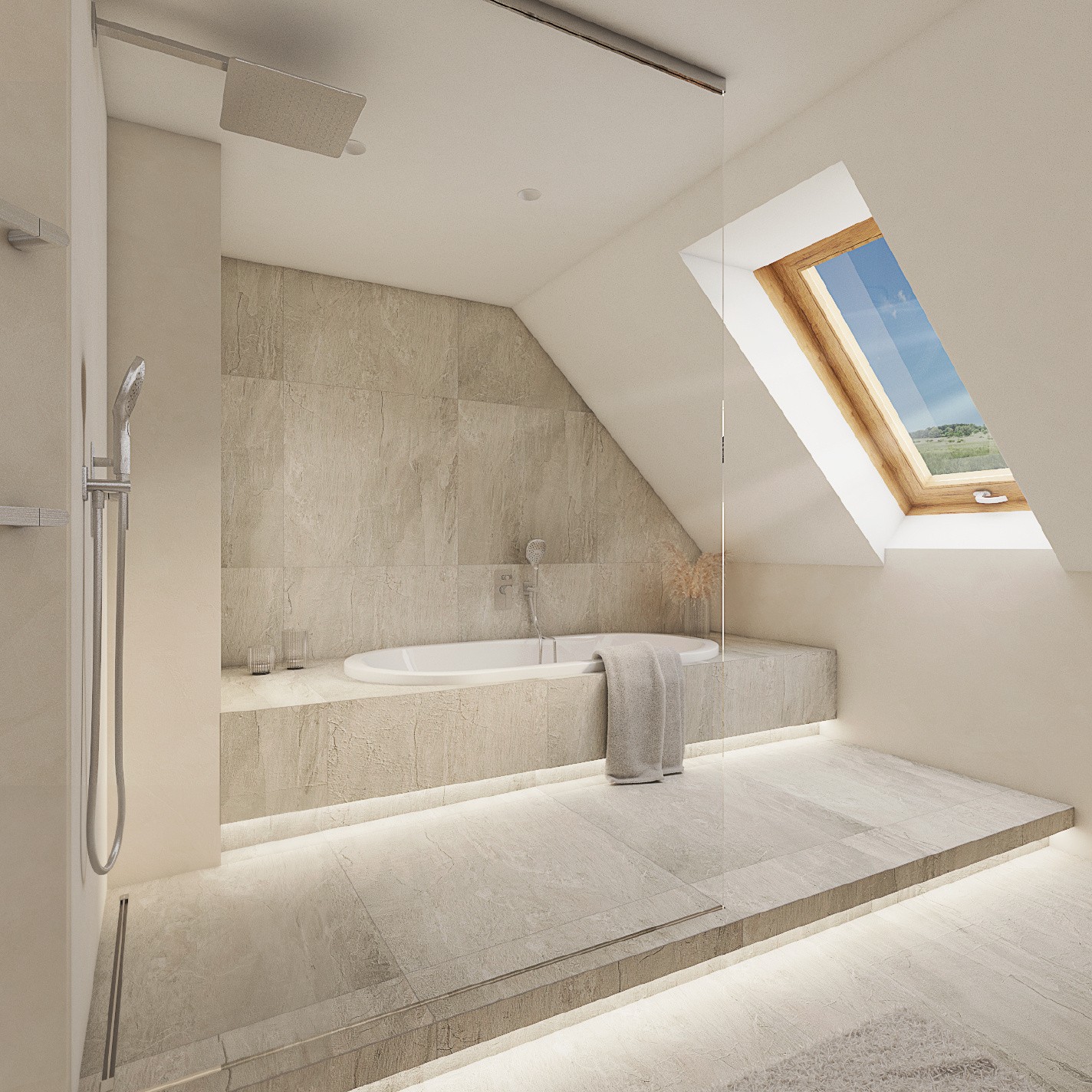 Šikmý strop je v koupelně vždycky výzva. Stoupnout si pod něj nejde, zato posadit se či poležet spolehlivě. Architektka Alexandra Kaščaková měla kvůli dispozici koupelny od začátku jasno v tom, kde co bude.