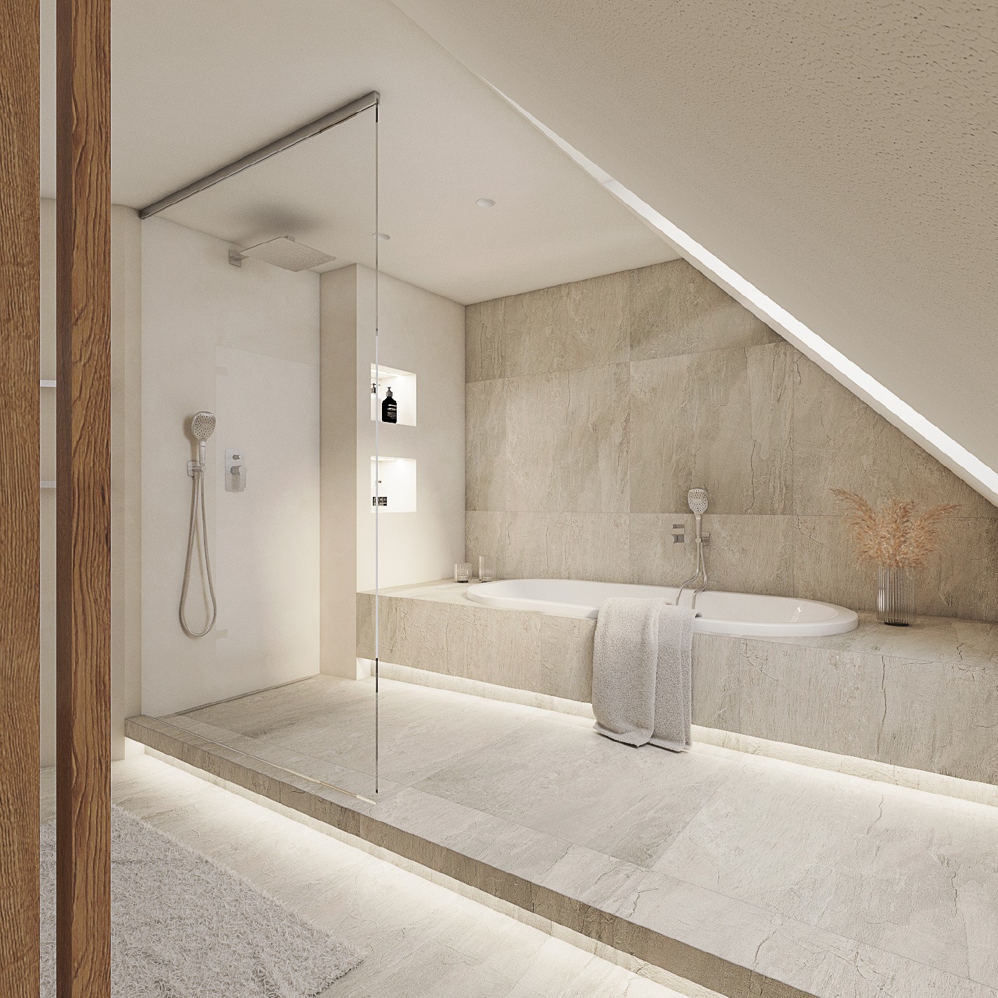 Koupelnu přitom logicky rozdělila na tzv. mokrou a suchou zónu. Mokré přisoudila více soukromí. Je dál od vstupních dveří. Vana i prostorný sprchový kout získaly čestné místo na stupínku. Když se večer setmí, stupínek i prostor pod obezděnou vanou jdou krásně podsvítit. Architektka tak udělala všechno pro to, aby se romantika v této koupelně zabydlela natrvalo.