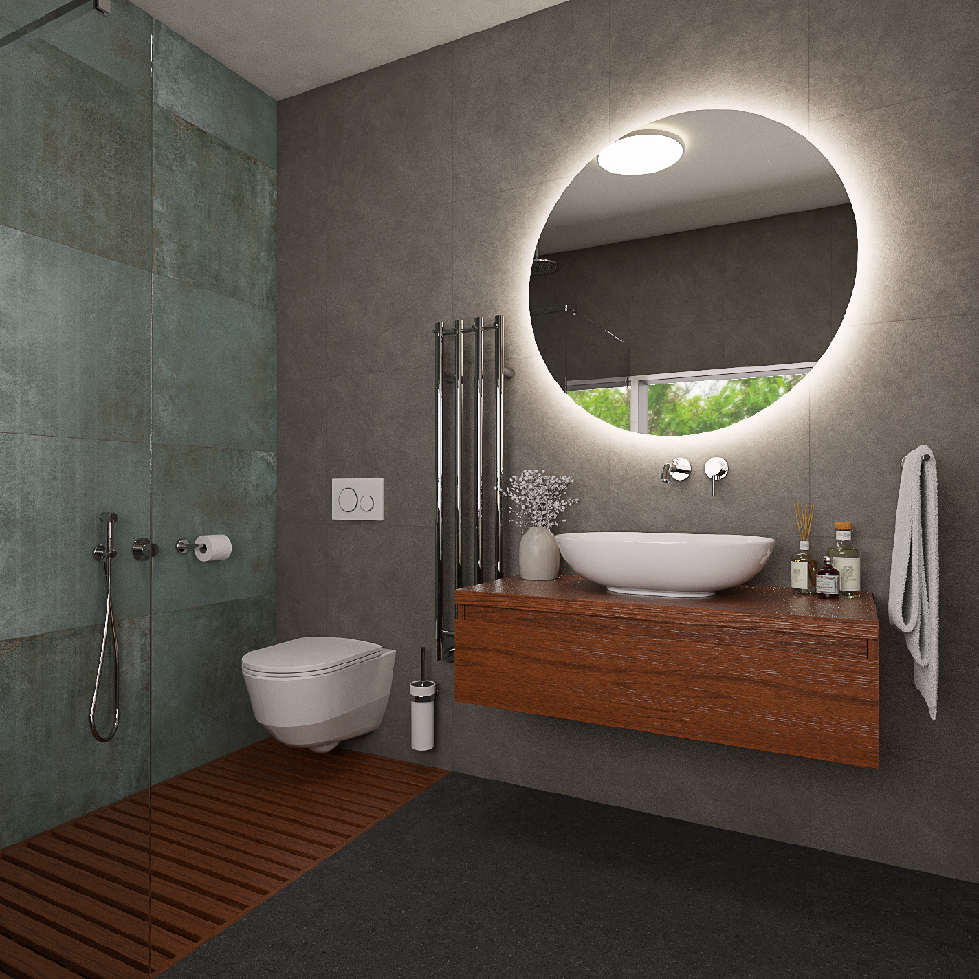 Vzhledem k výrazným tmavším barvám koupelnu rozsvěcují chromové baterie u prostorného umyvadla na desku, ve sprše, na zástěně, doplňcích či radiátoru.