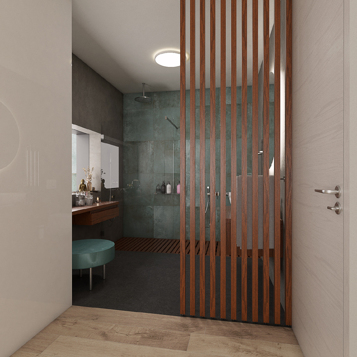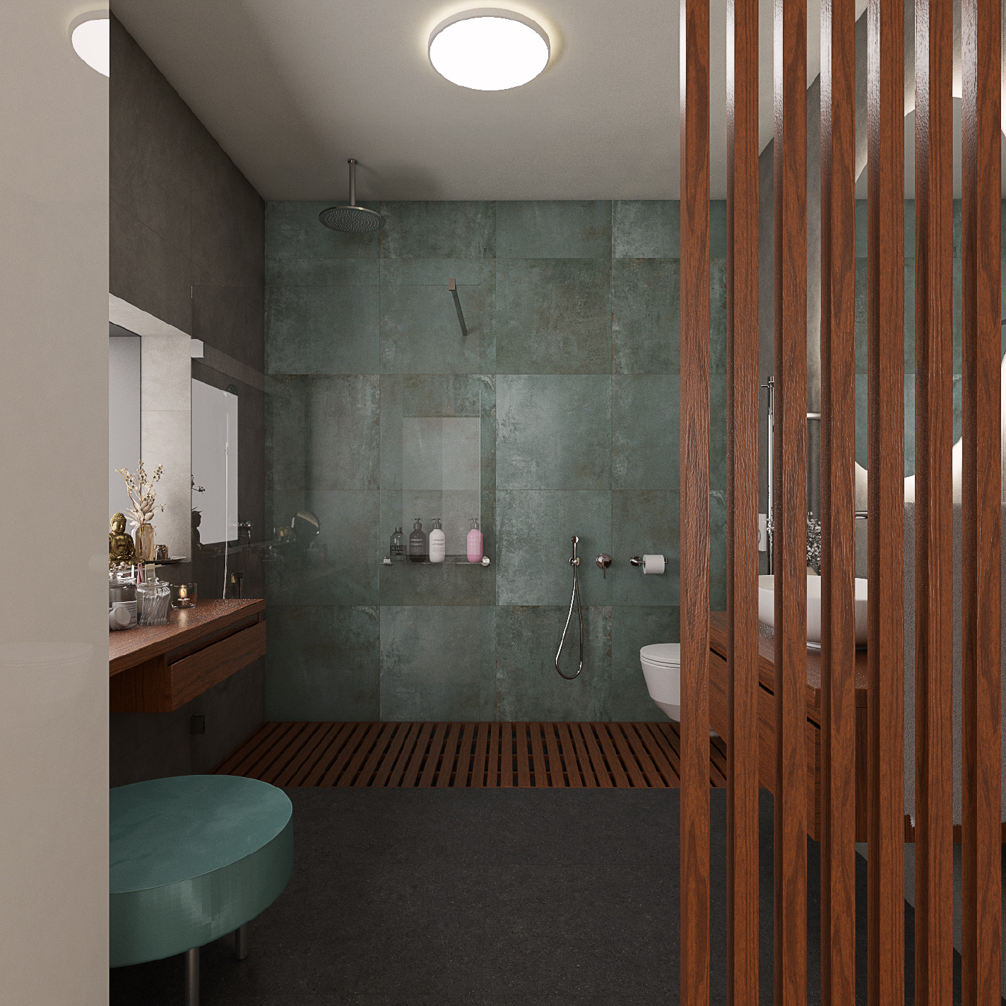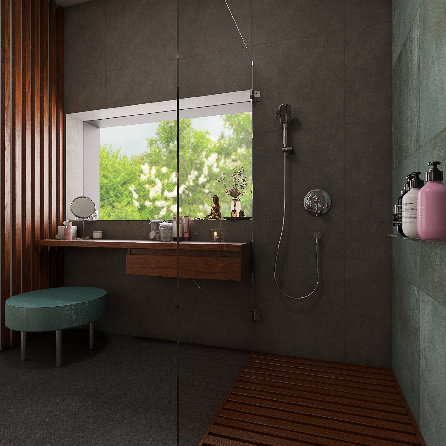 Díky přítomnosti velkého okna a propojení se světlou ložnicí bylo možné sáhnout po černé dlažbě v imitaci kamene, která pokrývá podlahu. Stěny na sebe vzaly podobu imitace stěrky v šedé a imitace kovu v zelené barvě. Tuto barvu nenajdeme nejen na pohledové zdi se sprchou, ale i na prostorné taburetce u kosmetického stolku.