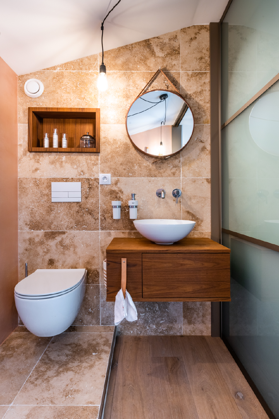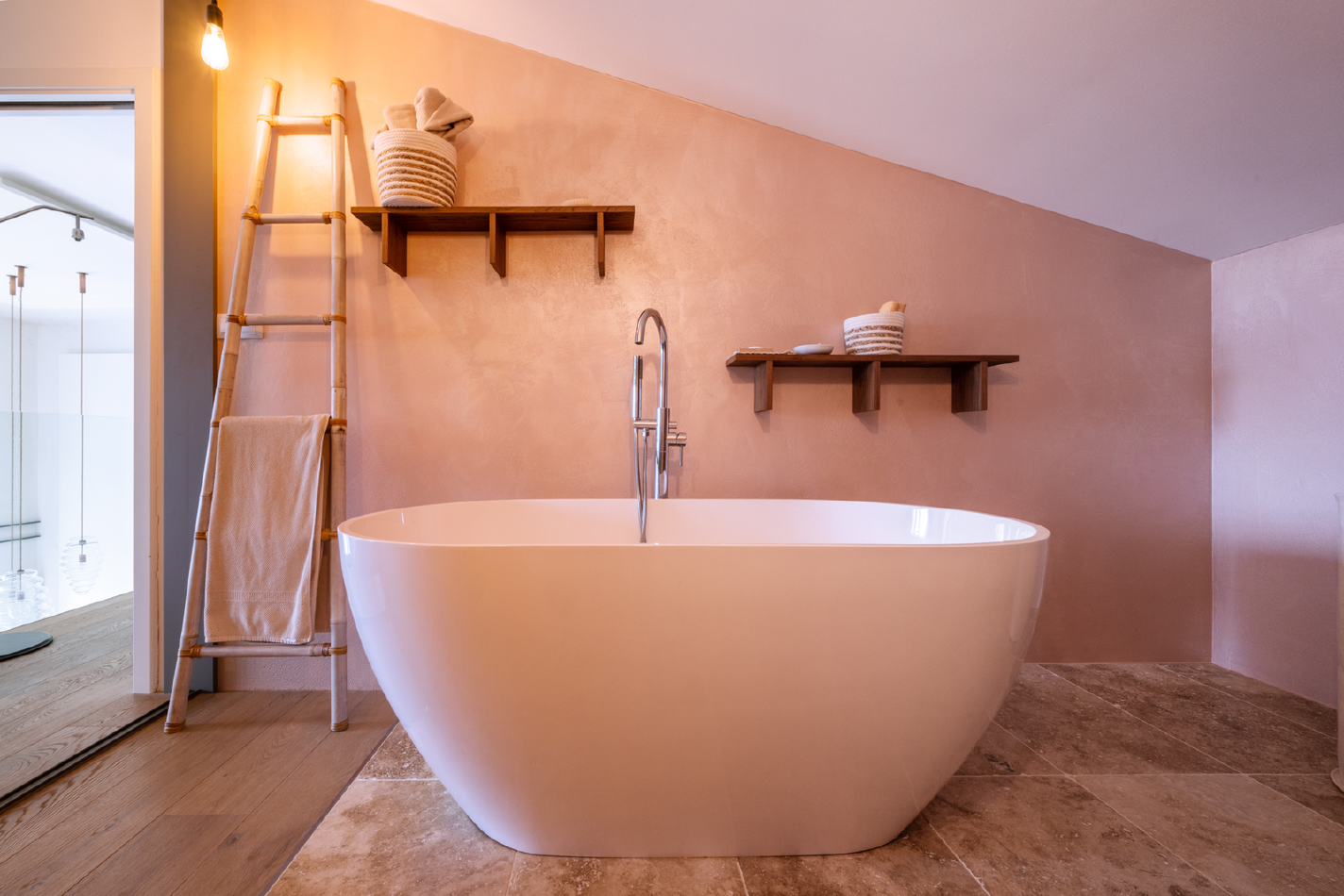 Vyjma prostoru za umyvadlem jsou veškeré stěny ošetřené dekorativní stěrkou, která jde ruku v ruce s vybavením koupelny. Celé prostředí je laděné do zemitých odstínů a doplněné černými prvky, jako je rám zrcadla či paravany. Také díky nim je relaxace a příjemný odpočinek tím hlavním, co při pohledu do prostoru koupelny člověk pociťuje.