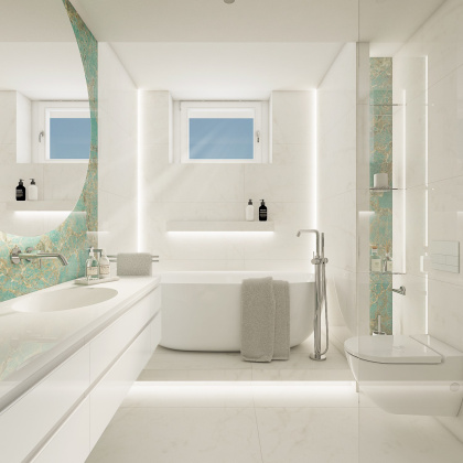 Trámy jsou přiznané i na stropě. Barevně odpovídají dveřím i nábytku. Velmi dobře si s nimi rozumí i epoxidová stěrka na většině stěn, které jsou vystavené působení vody. U polosolitérní rohové vany s dominantní solitérní baterií ji doplňuje modrý obklad v podsvícené nice.