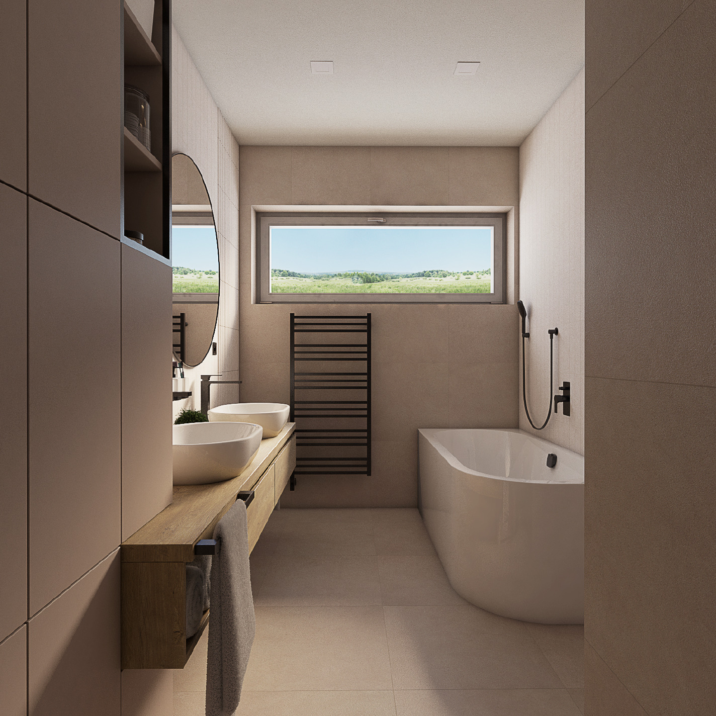 Tentokrát klientka přišla až v okamžiku, kdy bylo o dispozicích rozhodnuto, což nikdy není ideální. Architekt Jindřich Kobr se s tím vypořádal po svém a navrhl koupelnu v požadovaných krémových odstínech spolu s výraznou černou. Černé jsou nejen vanové a umyvadlové baterie Remer, ale také doplňky, radiátor či orámování nik.