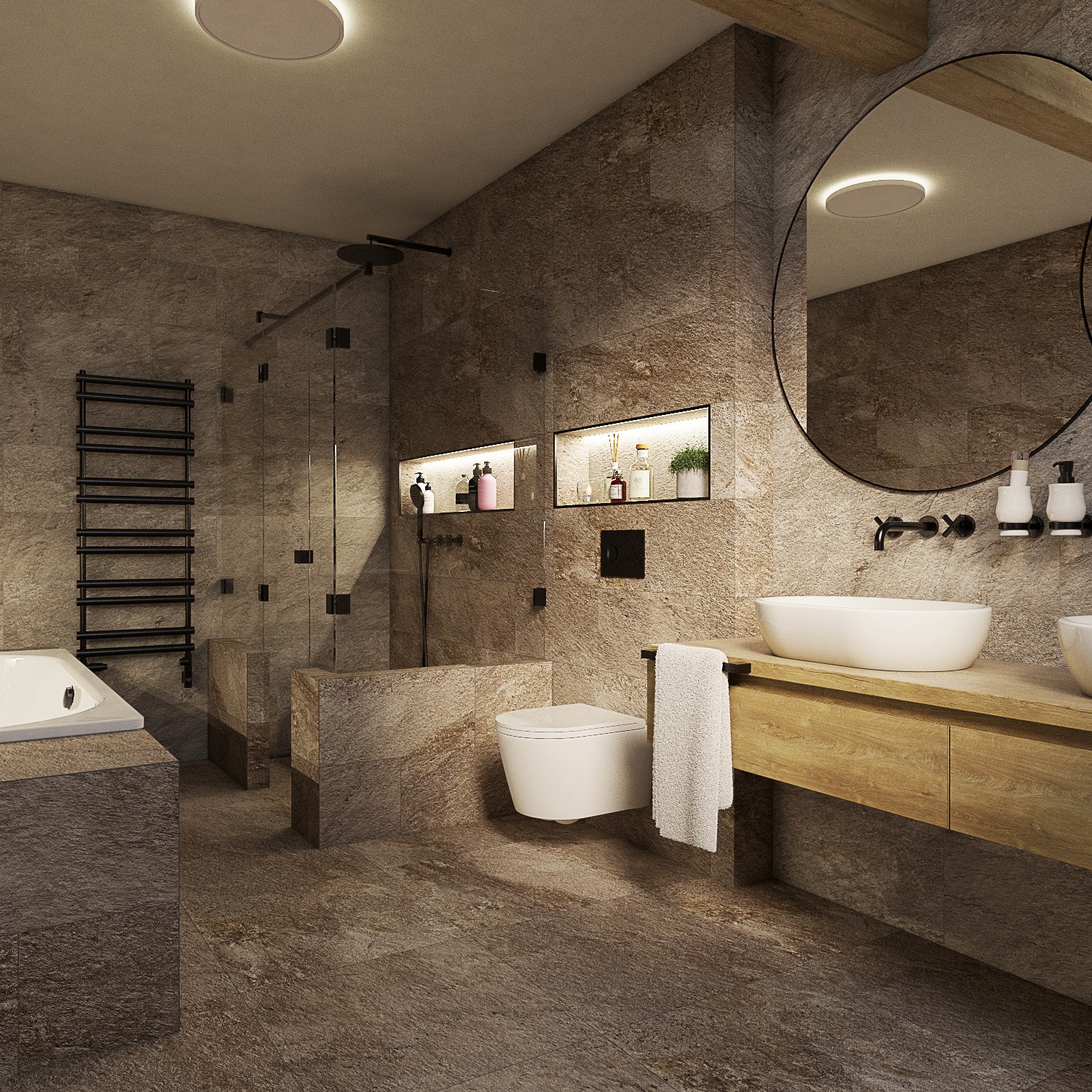 Matná černá je barvou všech doplňků od radiátoru přes sprchový kout až po tlačítko k toaletě. Černá nejlépe doprovází dominantní prvek celé koupelny, kterým je výrazná dlažba v reliéfním provedení, které opravdu věrně napodobuje kámen. Architekt ji využil ve dvou odstínech a rozměrech. Na stěnách se střídá šedá a hnědá dlažba, vyskládaná jako cihly. Zem pokrývají hnědé čtverce. Celý prostor díky tomu působí přírodním dojmem, což je u roubenky na místě.