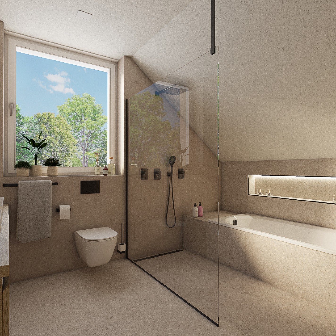 Podkrovní koupelna působí na první pohled velmi prostorně. Když si však všimneme šikmého stropu nad polovinou celého půdorysu, uvědomíme si, že bylo nutné opravdu důmyslně kalkulovat, aby se do koupelny dostaly všechny požadované prvky a koupelna si dojem prostornosti zachovala.