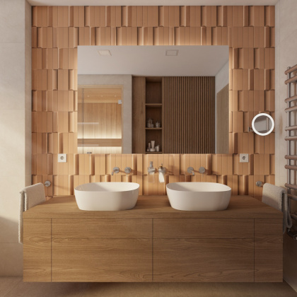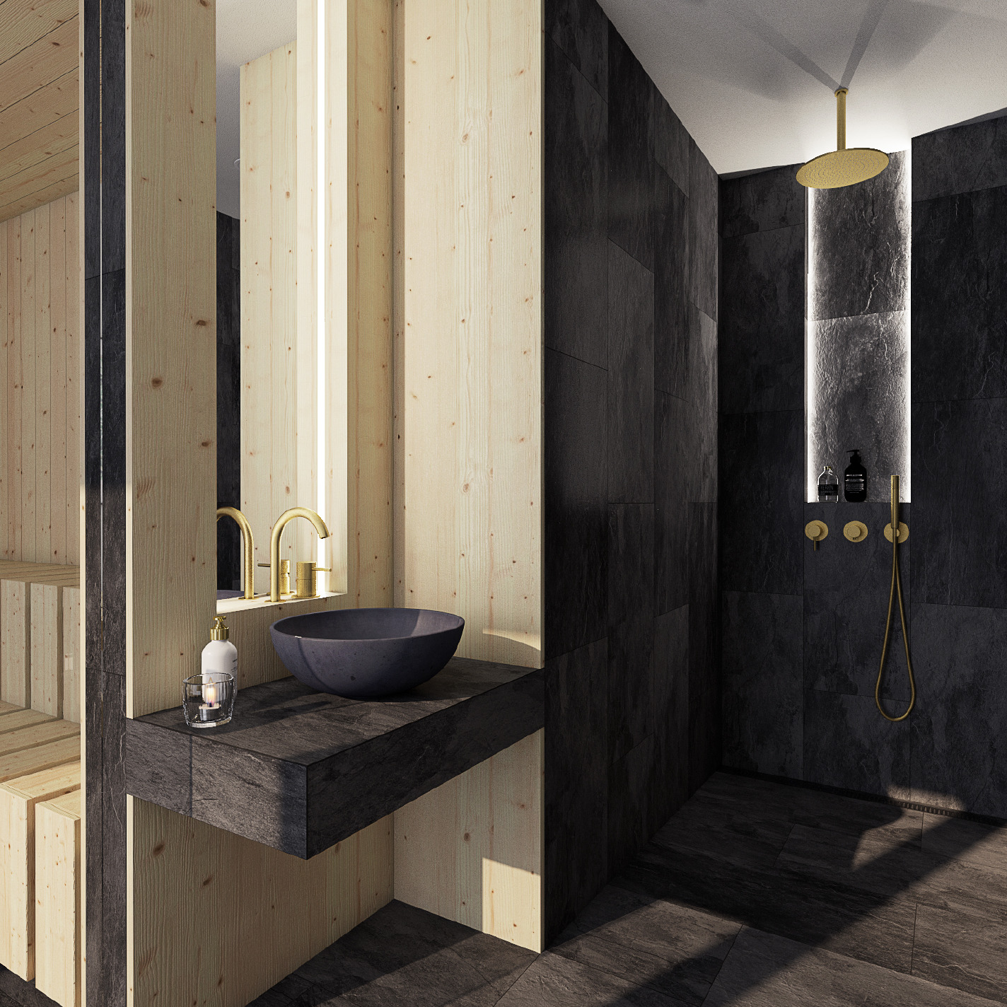 Celek působí velmi harmonicky a zároveň luxusně. Podílejí se na tom zlaté baterie v otevřeném sprchovém koutě s podsvícenou nikou i betonové umyvadlo na desku, které je tím prvním, co po vstupu upoutá vaši pozornost. Dřevěné obložení umyvadla a dvouprvková umyvadlová baterie, která prýští rovnou ze dřevěné niky se zrcadlem nenechá nikoho na pochybách, že tady je vše určené pro blahodárný odpočinek. Velké lehátko s výhledem do přírody zve do své náruče po každém saunovém cyklu. Co víc si přát?