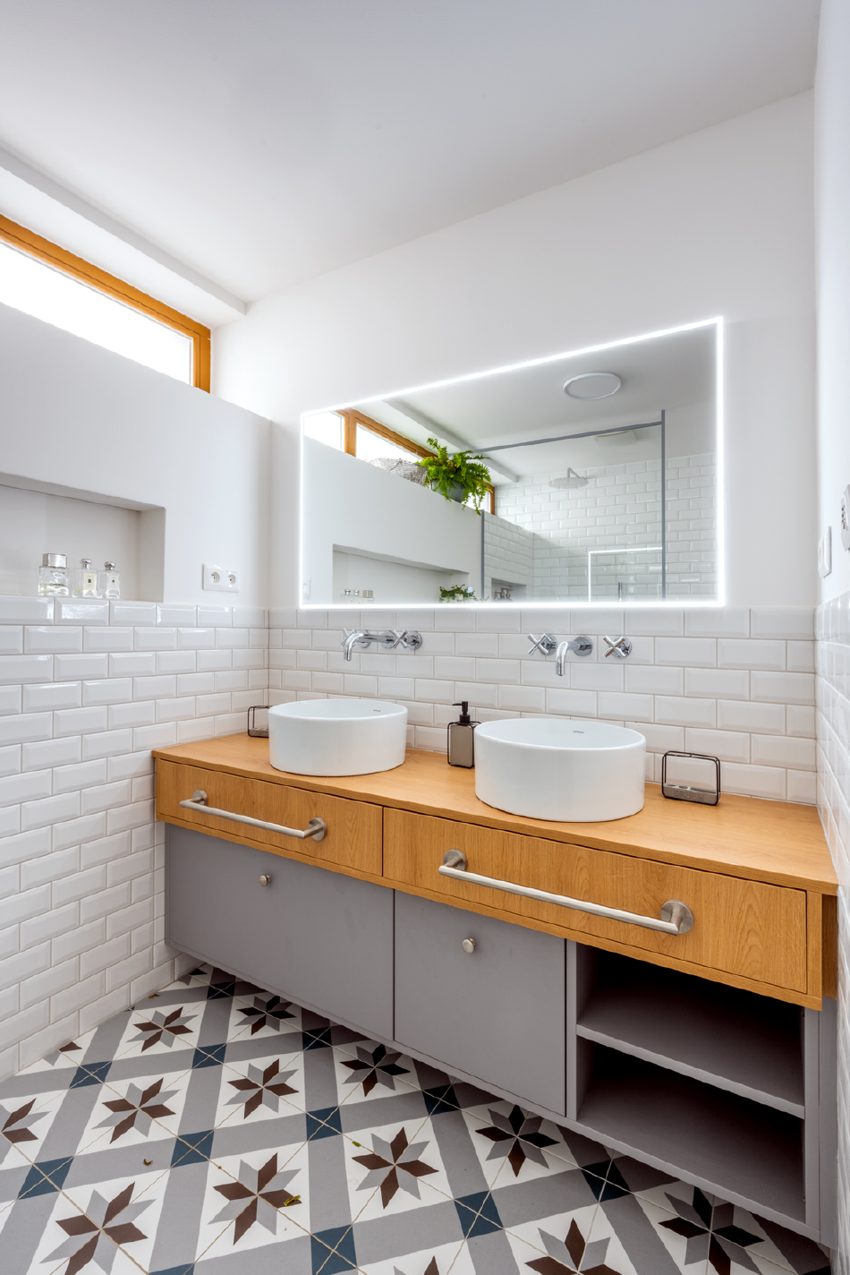 Stěny si pro sebe zvolily jednoduchý bílý psaníčkový obklad. Každá z nich přitom představuje samostatnou zónu. Hned za dveřmi najdeme skříňku s prostornými umyvadly na desku, která se vine podél celé stěny. Vytvořená je ze dvou materiálů. Spodní v šedé barvě a horní v dřevo dekoru, jaký najdeme i na oknech či dveřích.