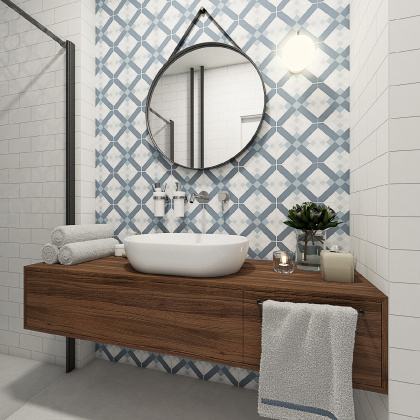 Koupelna dýchá retro stylem, především díky patchworkovým obkladům, které pokrývají celou jednu stěnu. Obklad působí dojmem klasické tapety. Ostatní stěny získaly psaníčkový obklad ve světlém tónu.