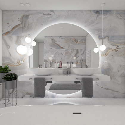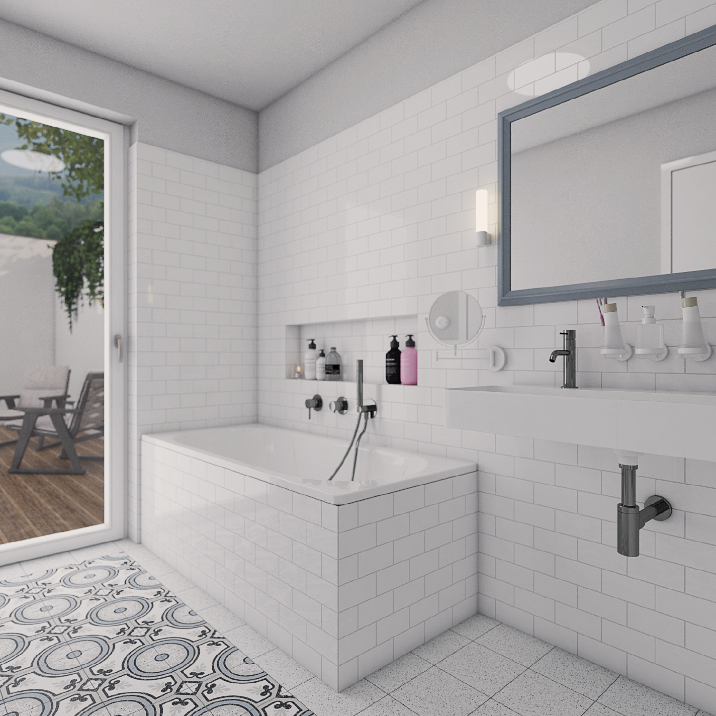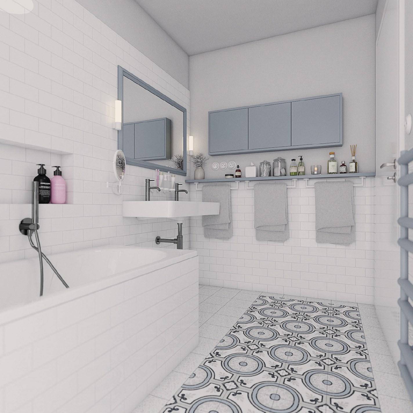 Dům z 20. let vyžadoval koupelnu v retro stylu. Architekt Jindřich Kobr požadovaného vzhledu docílil pomocí bílého patchworku v imitaci terazzo dlažby, který ozvláštňuje dekorovaný pruh. Tento pruh nachází odezvu na nábytku, orámování velkého zrcadla, ale také na radiátoru, které získaly shodně namodralý nádech. Ostatní stěny či obložení vany na sebe vzaly podobu bílého psaníčka, pouze stropní část je světle šedá.