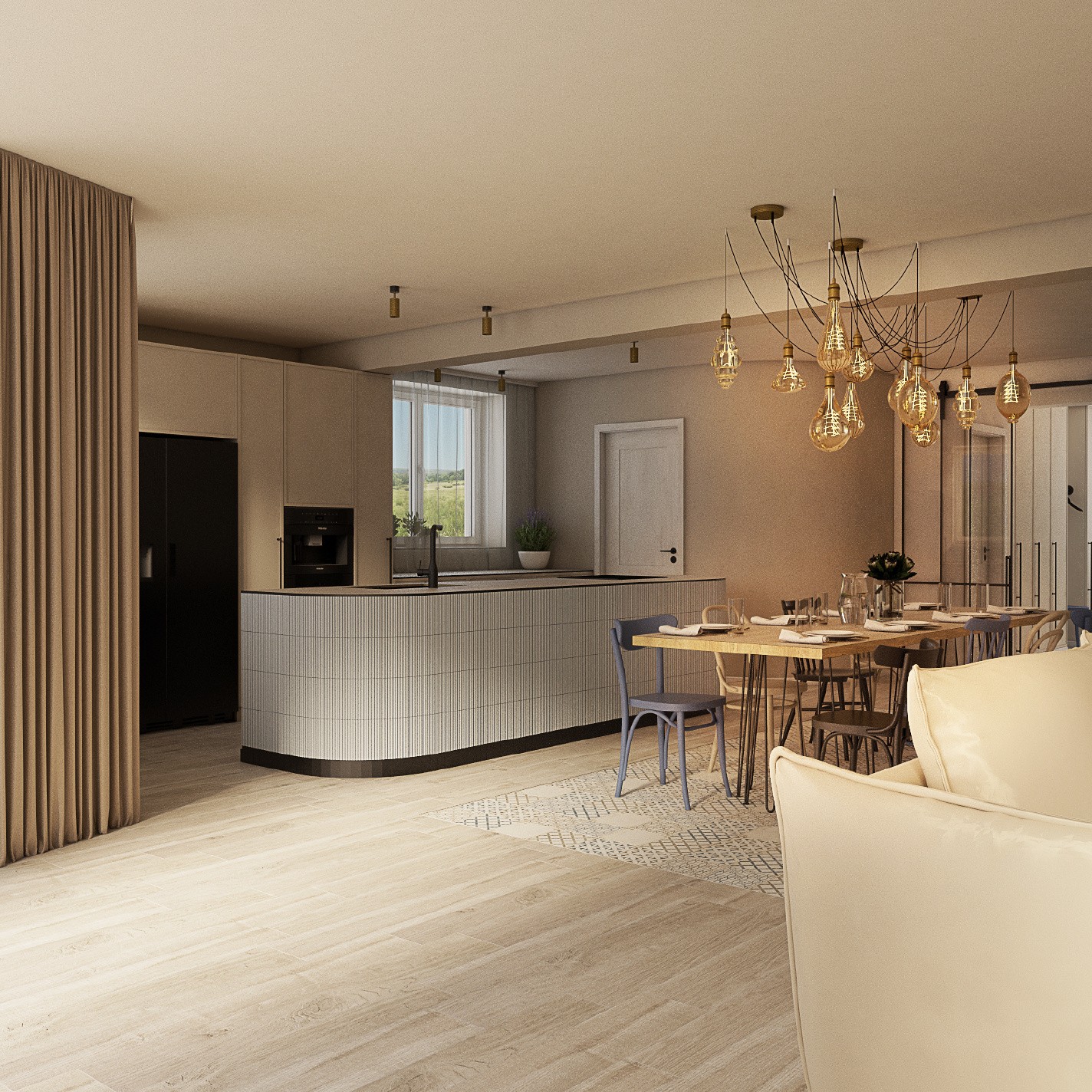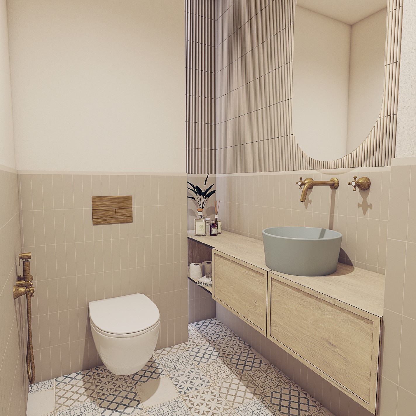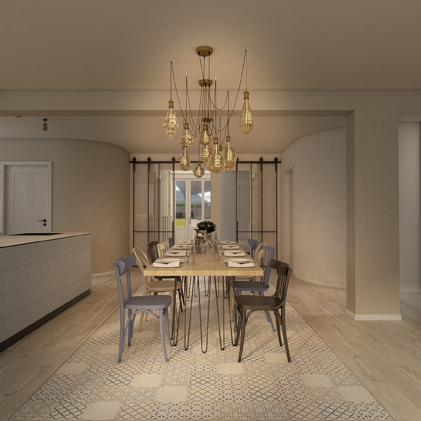 Cesta k návrhu interiéru rodinného domu vedla přes koupelny. S těmi byli klienti natolik spokojeni, že požádali architekta Jindřicha Kobra o navržení celého domu. Jindřich se do díla pustil s vervou a pozměnil původní dispozice tak, aby domov získal více světla a svým majitelům lépe sloužil. Ostré hrany v přízemí zjemnil obloukovými prvky s 3D vlnkovitým keramickým obkladem na ostrůvku otevřené kuchyně i na stěnách vstupní haly. Srdcem interiéru se stal prostorný jídelní stůl s židlemi značky TON v různých tvarech i barvách. Podlahu s dlažbou v imitaci dřeva střídá výrazná patchworková dlažba, na které najdeme sedm různých motivů a barev. Modrou, která je nejvýrazněji zastoupená na stěrkovém schodišti a tapetě, přírodní hnědou, béžovou, bílou a černou doplňuje v interiéru ještě mosaz. Tu najdeme i na originálním osvětlení nad jídelním stolem. Venkovský styl v moderním hávu poskytuje útulné bydlení se vším, co k němu patří.