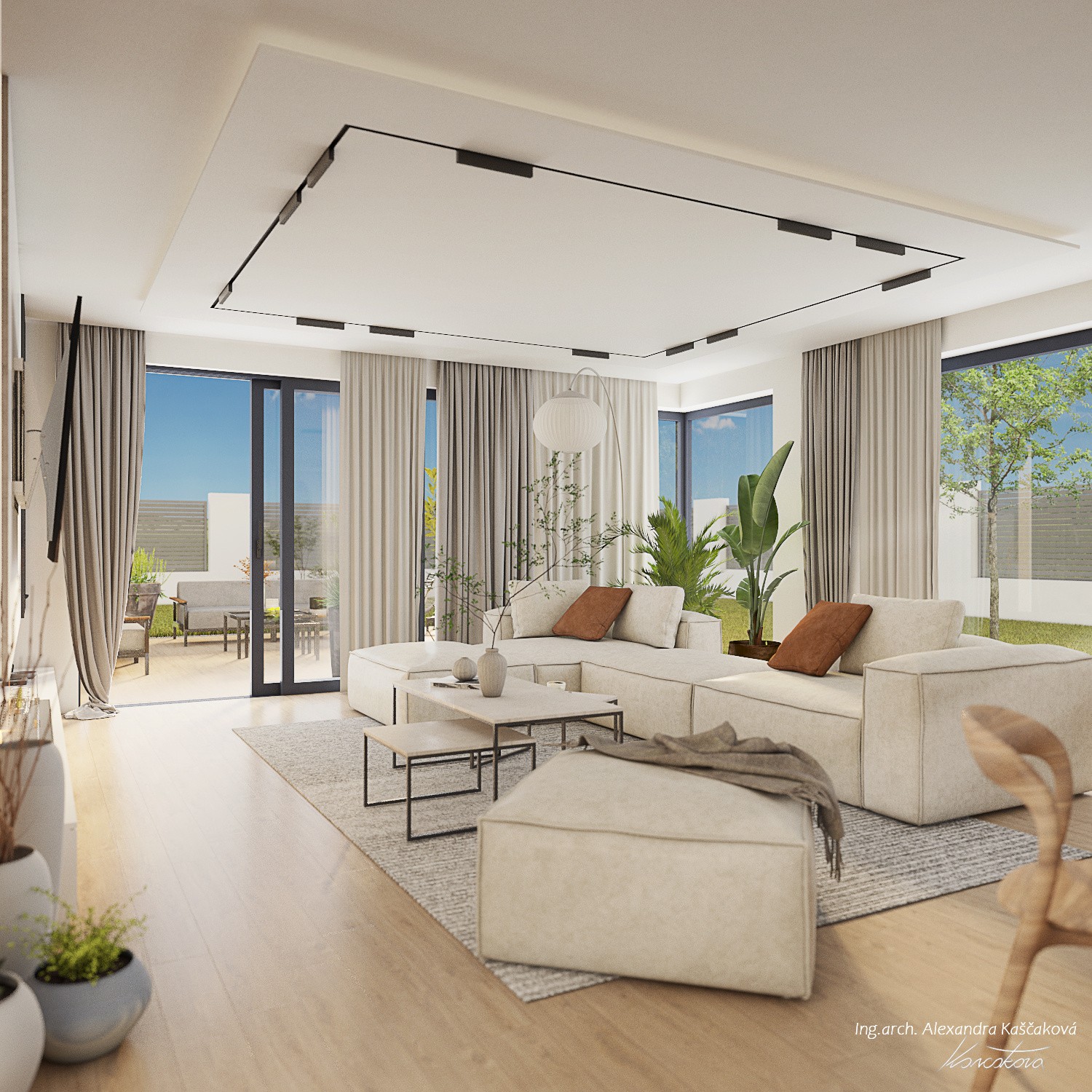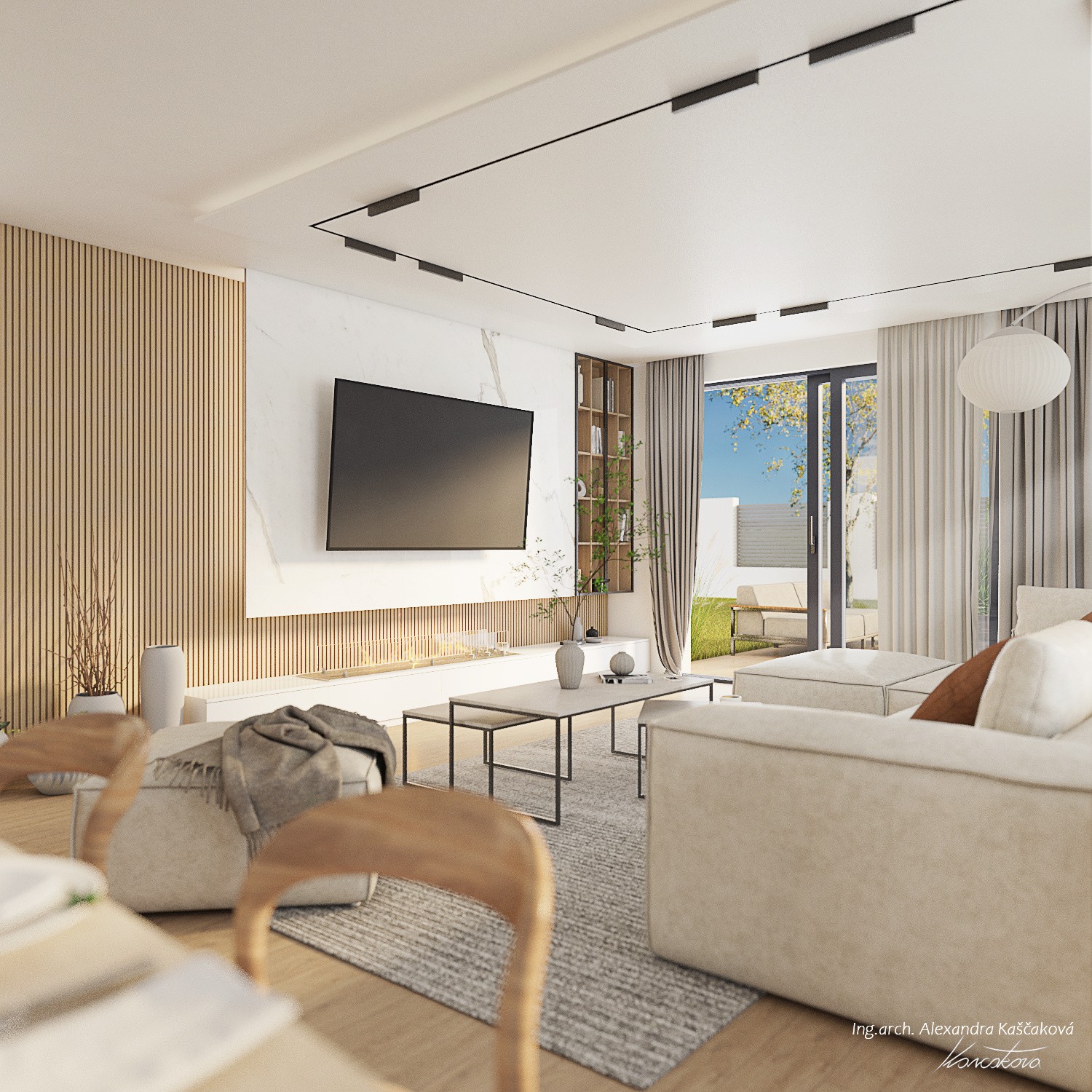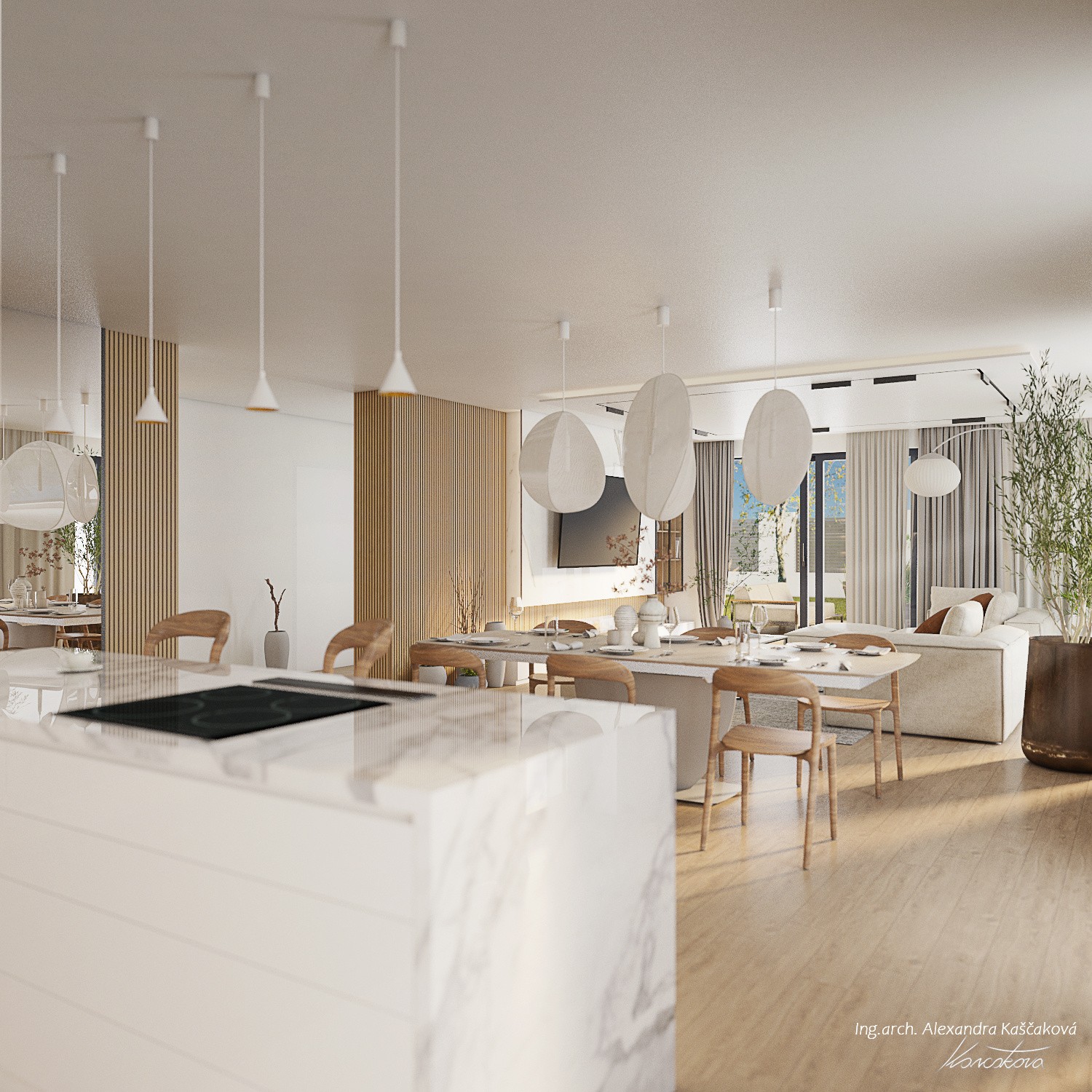 Když klienti oslovili architektku Alexandru Kaščakovou, měli už návrh kuchyně od kuchyňského studia. Ten však nevyužíval potenciálu, takže se začínalo nanovo. Klíčovými slovy byl světlý, útulný a elegantní design. Světlosti se docílilo volbou materiálů i barev. Světlé jsou dubové židle, kuchyňská deska v imitaci světlého mramoru i bílé sofa. Útulnost dodal lamelový obklad za televizí, který je protažený až k vinotéce, či modulová sedací souprava, kterou je možné poskládat tak, jak se to zrovna hodí. Elegance potom čiší z celku, který do sebe perfektně zapadá.