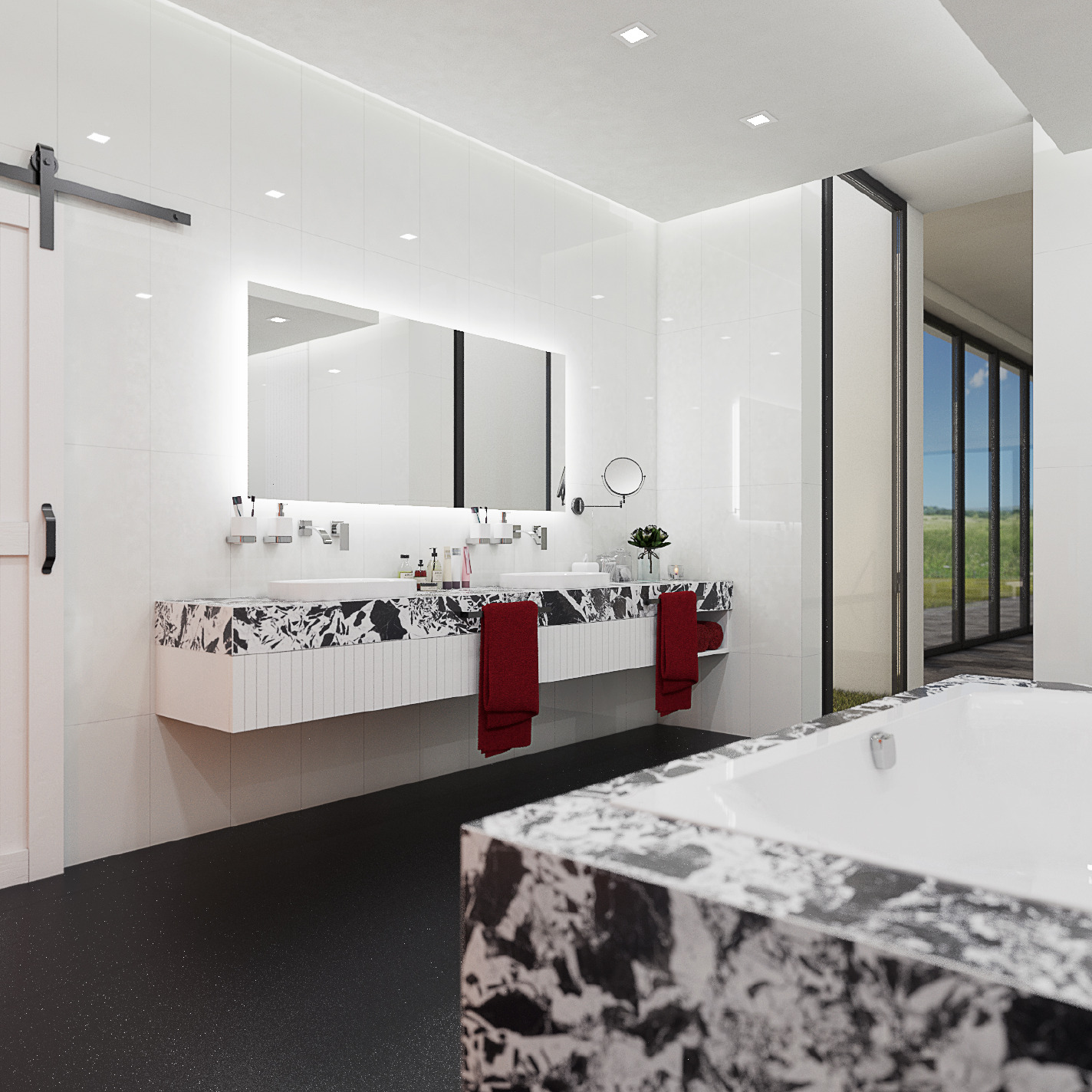 Požadavky klientů zněly jednoduše: vzdušnost a černo-bílý design. Velkorysý prostor bylo nutné rozumně rozčlenit, aby se vzdušnost zachovala. Architekt Jindřich Kobrnavrhl uprostřed místnosti dělicí příčku s vanou na jedné straně a sprchovým koutem na druhé. Obložil ji, stejně jako desku pod obě umyvadla, extravagantní flekatou dlažbou. V příčce jsou šikovně navržené niky, ale také luxferová vertikála pro větší prostupnost světla. Celé mycí království vymezuje také členitý strop s LED podsvícením.